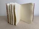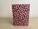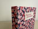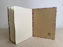 Couverture en carton recyclé rigide recouverte d’un tissu imprimé en coton et d’une étiquette calligraphiée au pinceau puis collée.
