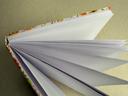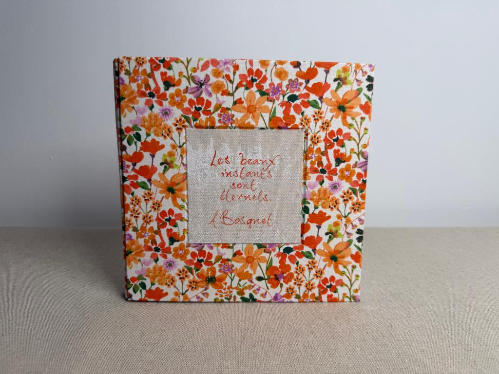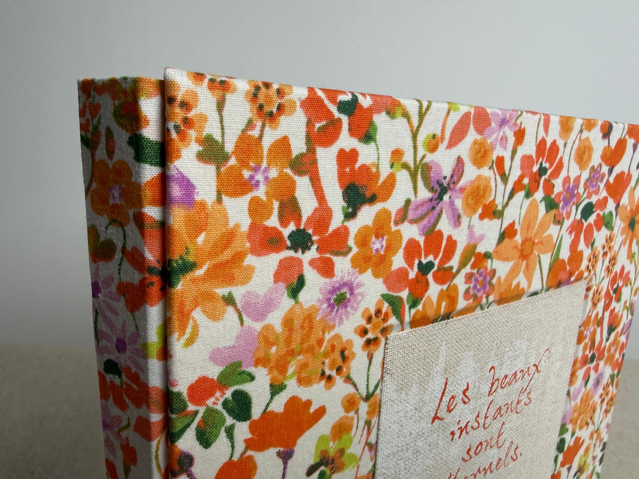 Couverture en carton recyclé rigide recouverte d’un tissu imprimé en coton avec son étiquette en tissu calligraphiée à l’encre indélébile puis collée.