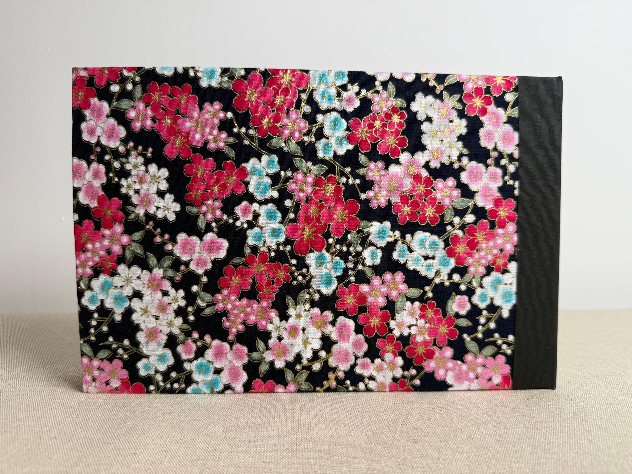 Couverture en carton rigide recouverte d’un tissu imprimé en coton et d’une étiquette calligraphiée au pinceau puis collée. Le dos est recouvert d’une toile de reliure.