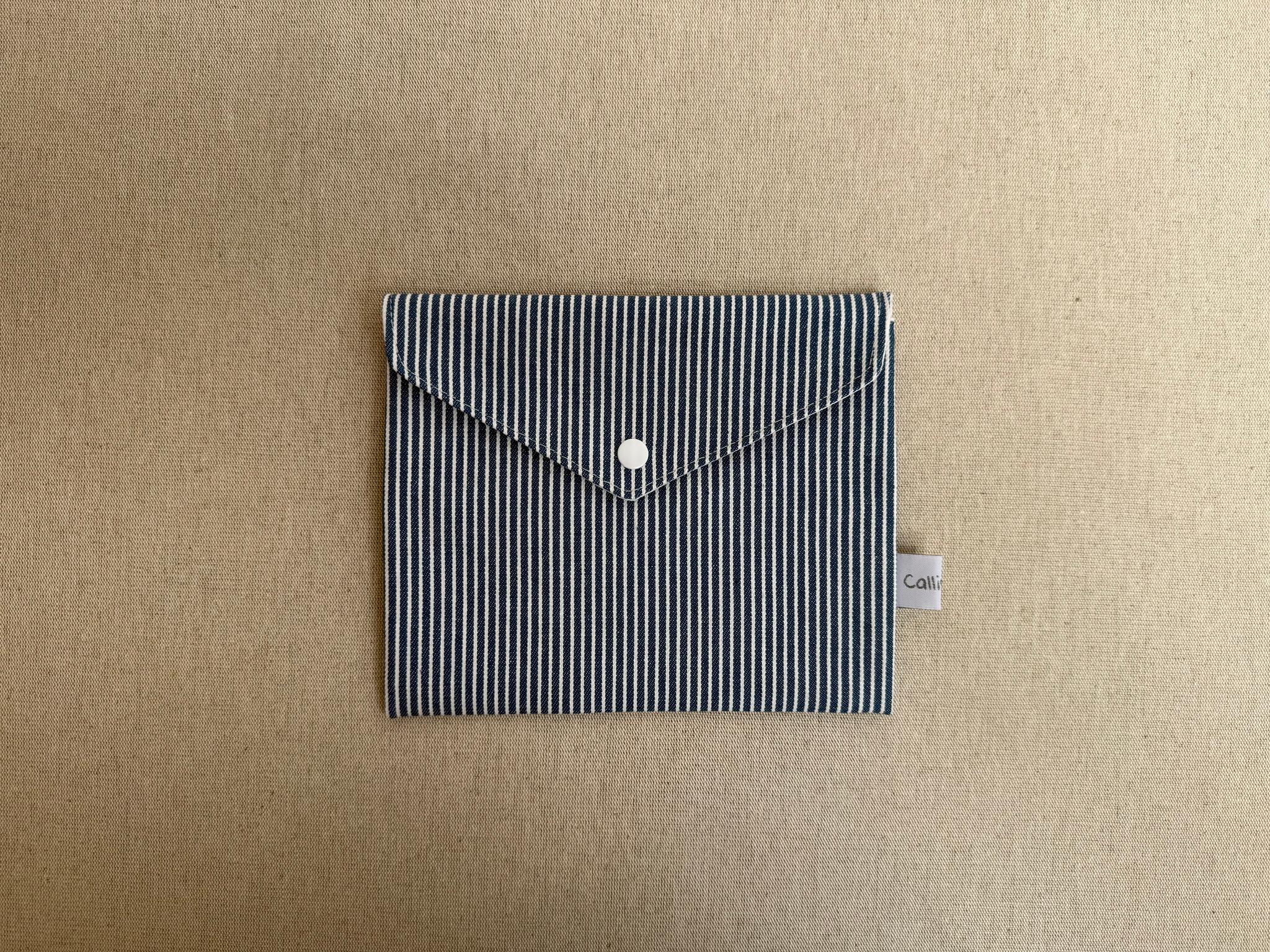 Petite pochette en tissu, en coton à rayures bleu jean pour protéger votre carnet, ranger des documents ou d’autres objets… À l’intérieur, tissu en coton épais blanc. Fermeture avec un bouton pression.