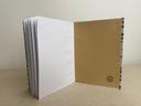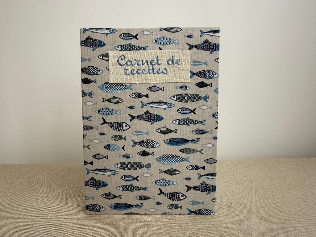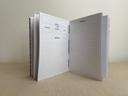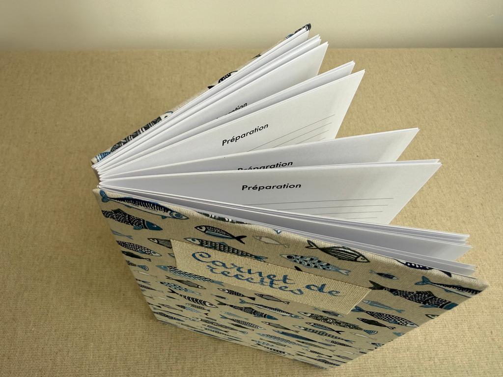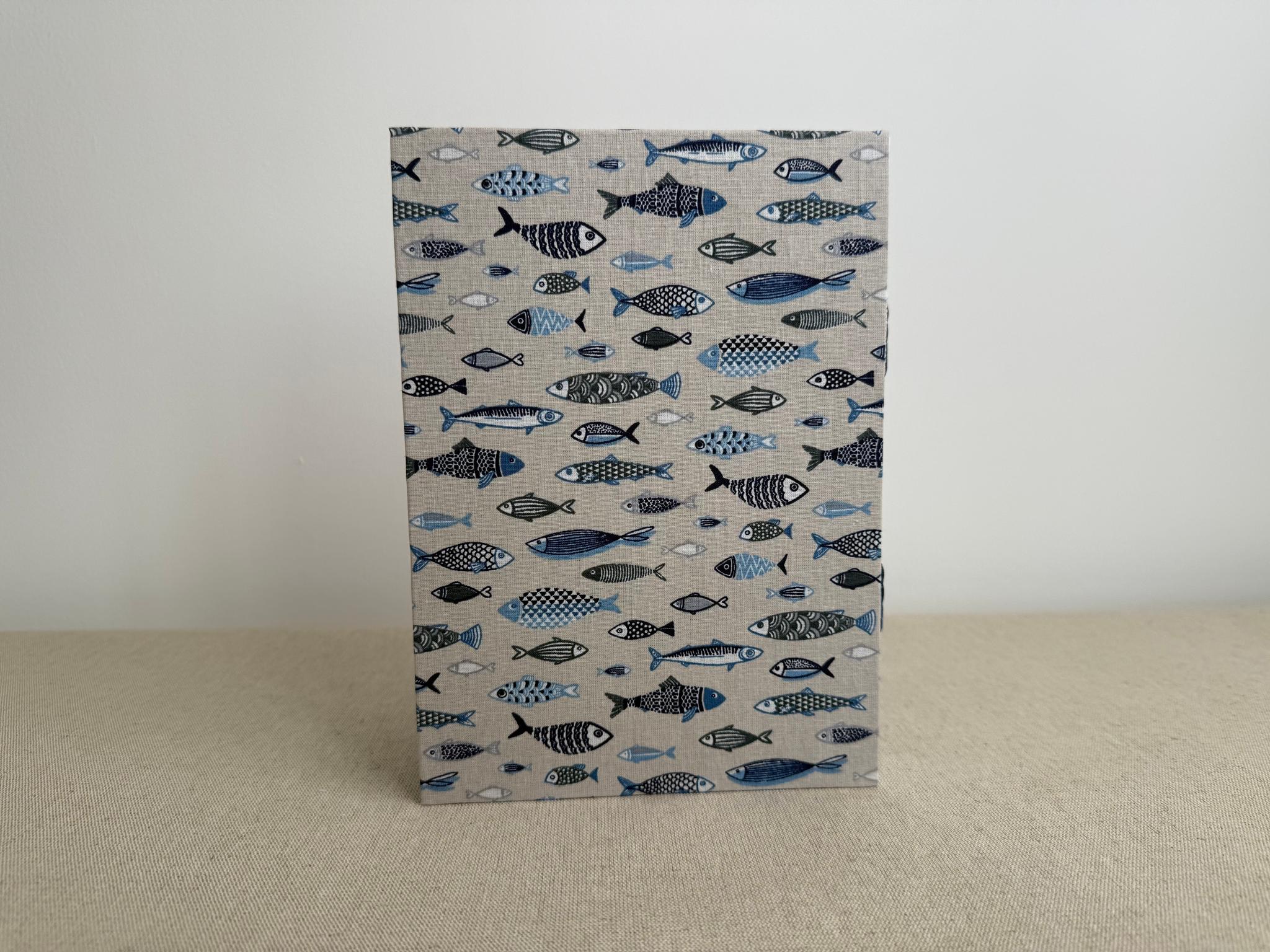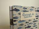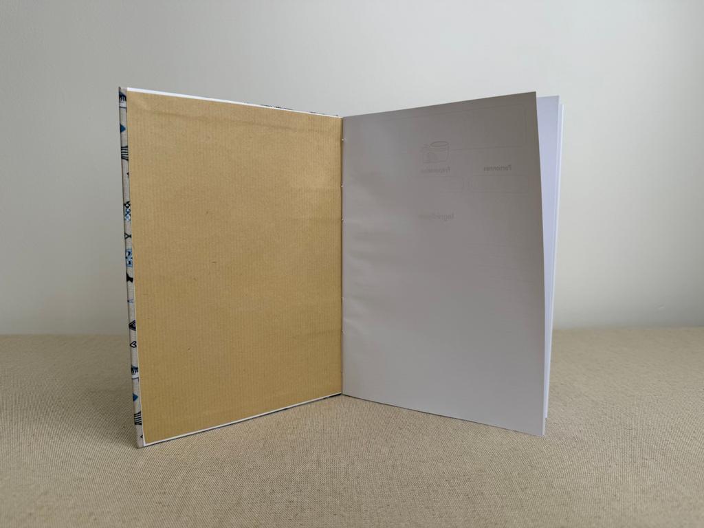 Couverture en carton recyclé rigide recouverte d’un tissu imprimé en coton et d’une étiquette calligraphiée au pinceau puis collée.