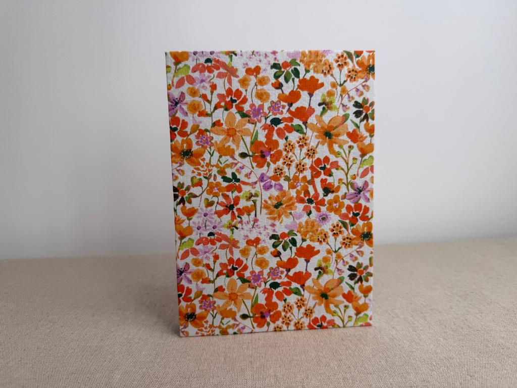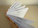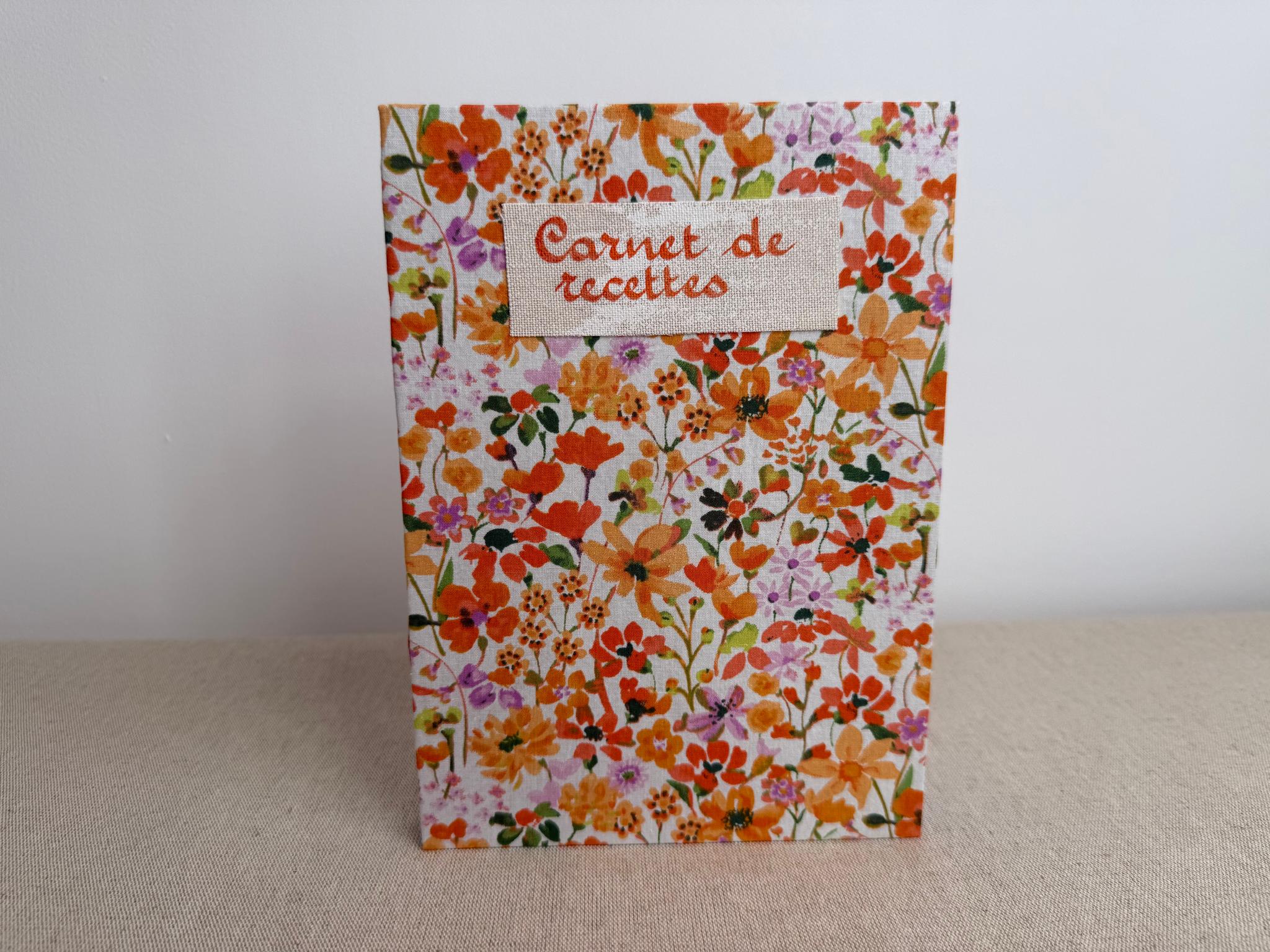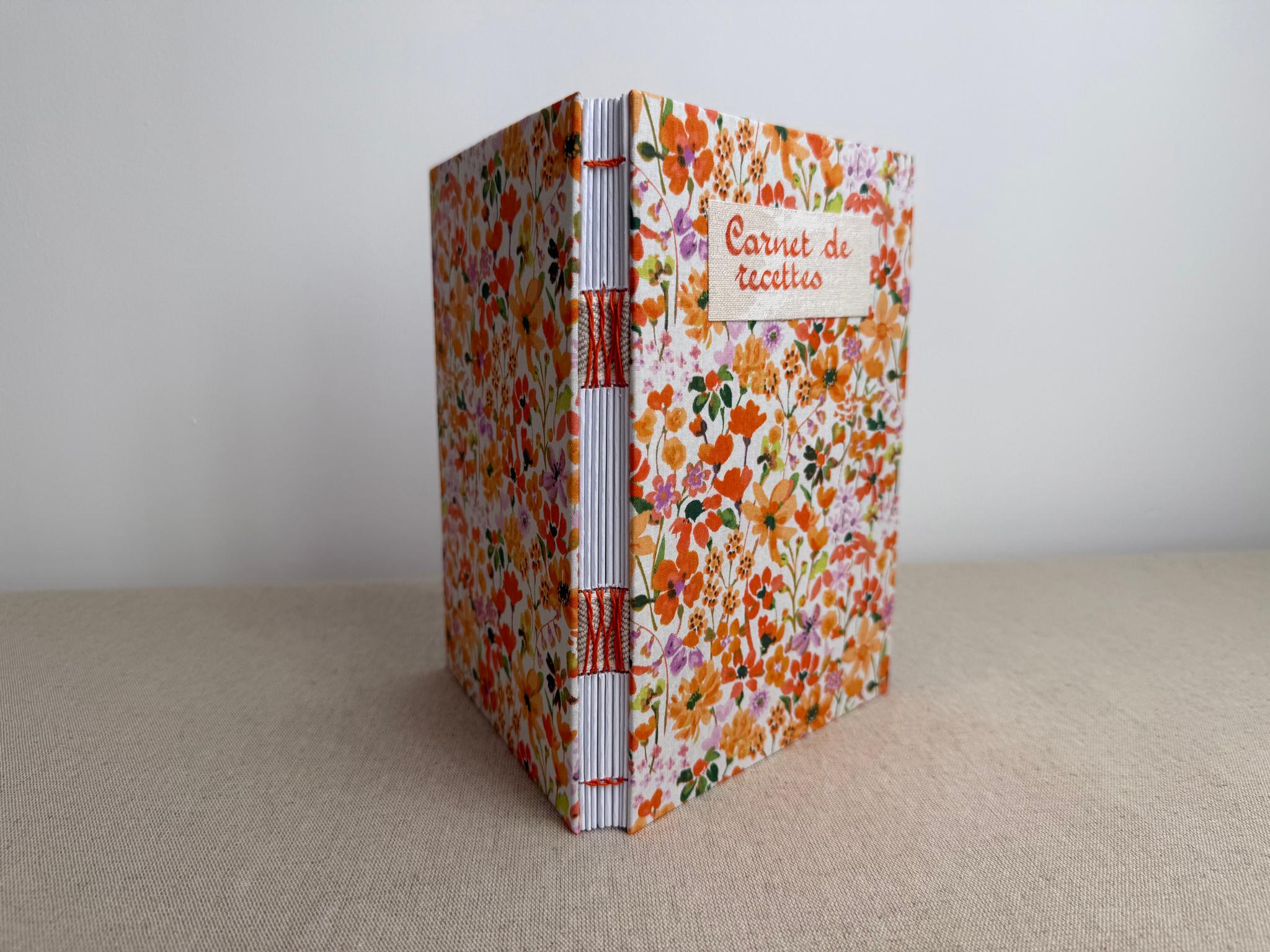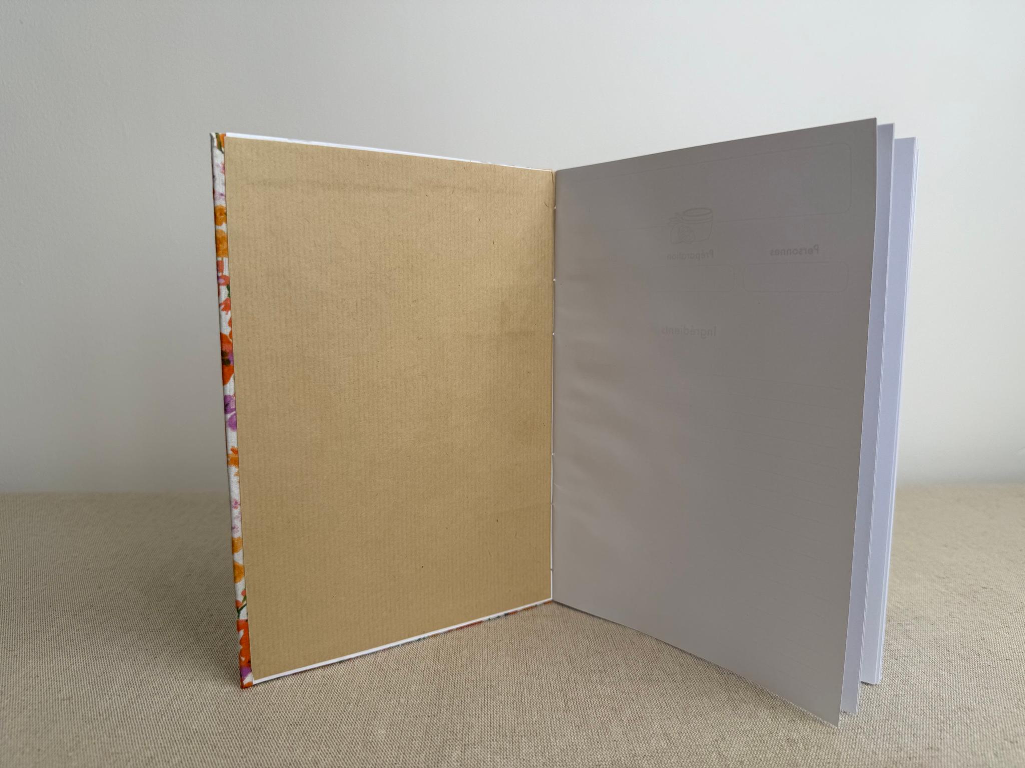 Couverture en carton recyclé rigide recouverte d’un tissu imprimé en coton et d’une étiquette calligraphiée au pinceau puis collée.