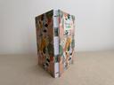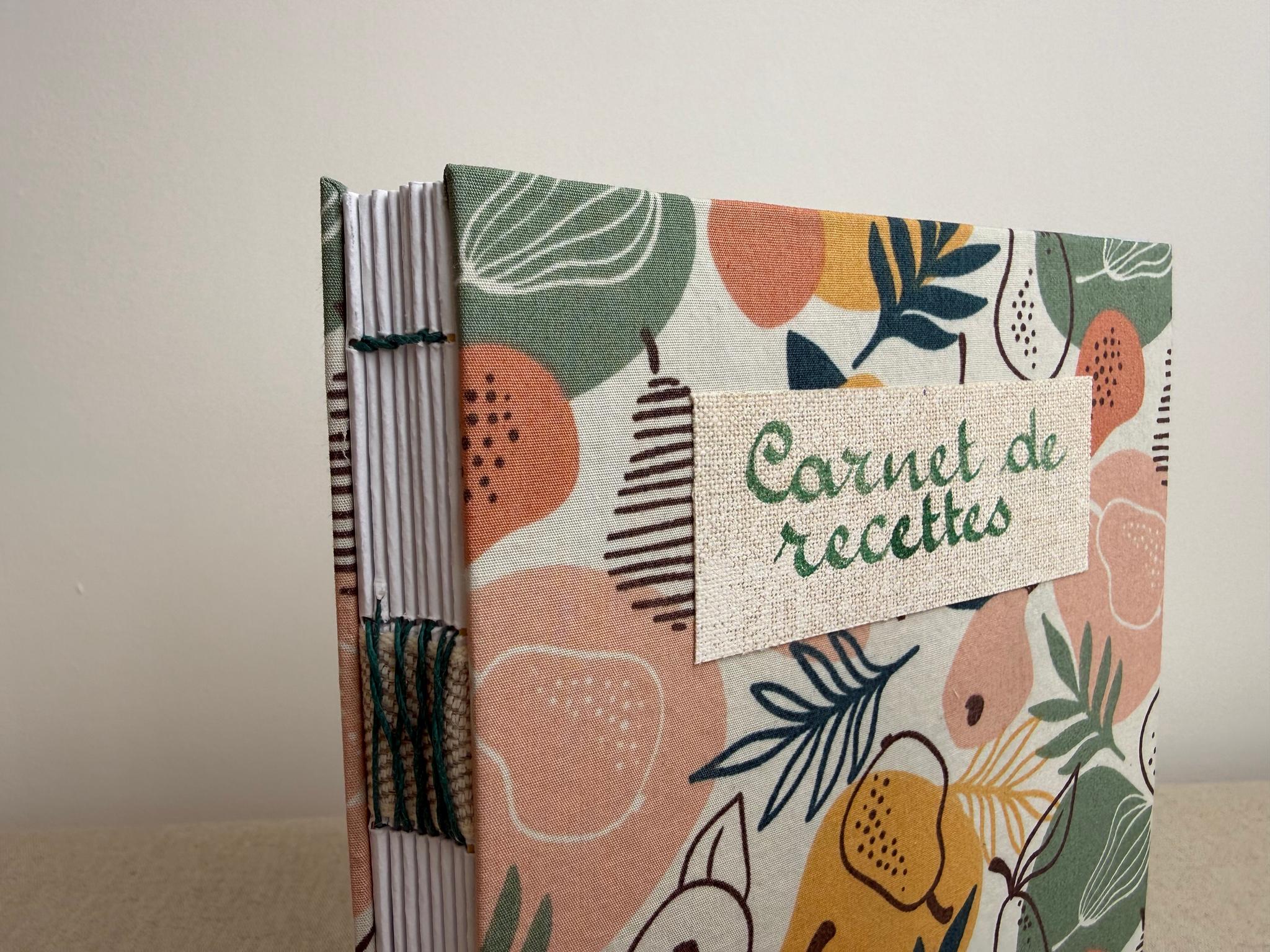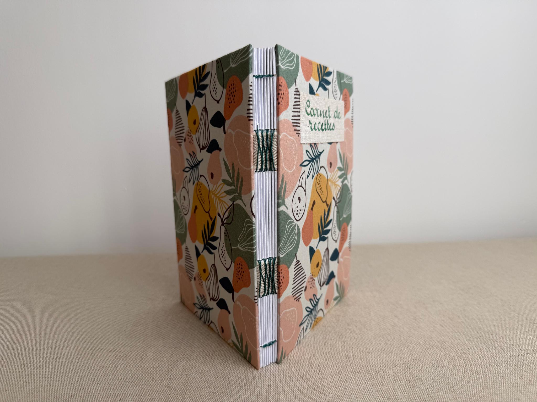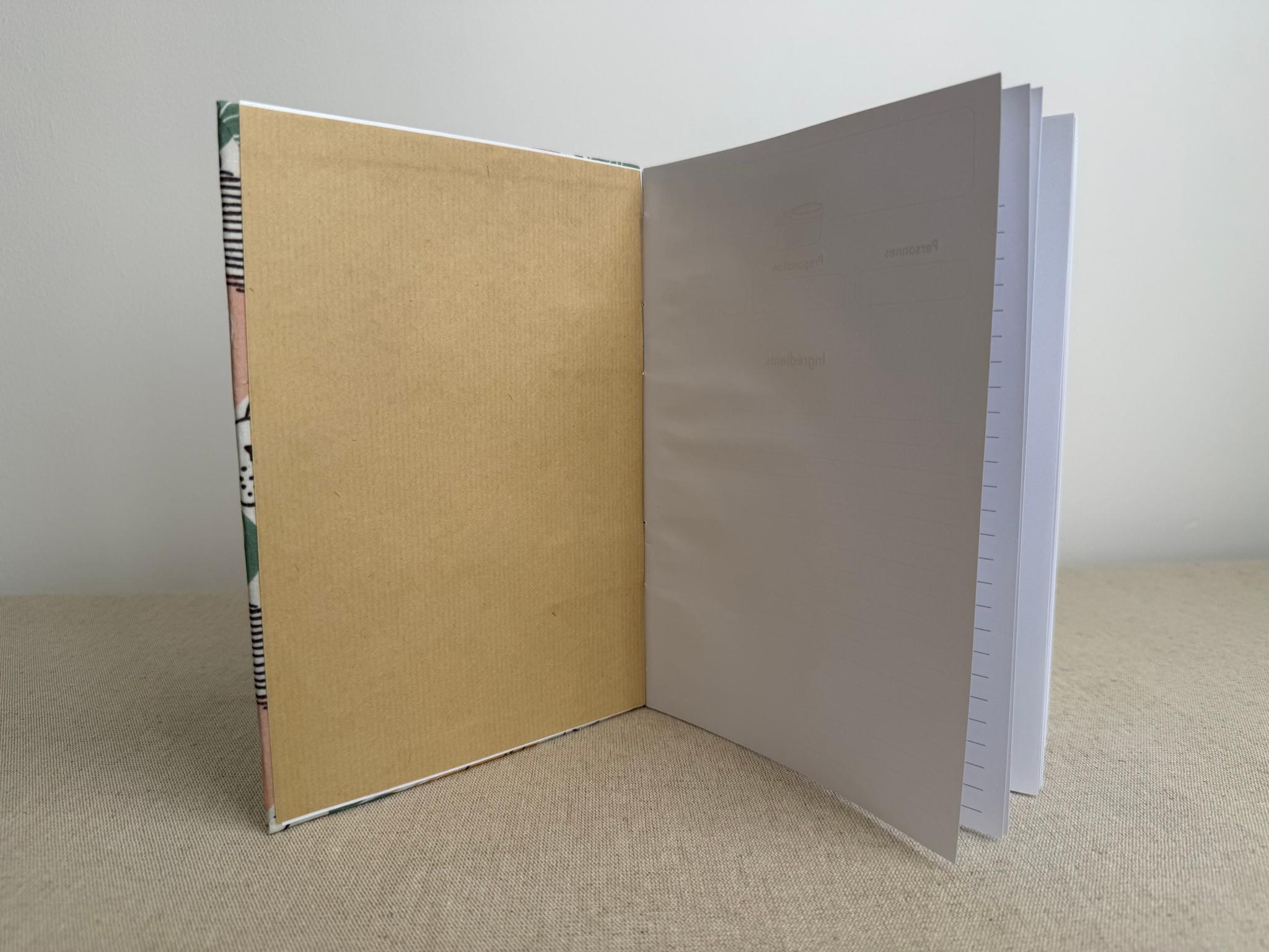 Couverture en carton recyclé rigide recouverte d’un tissu imprimé en coton et d’une étiquette calligraphiée au pinceau puis collée.