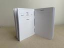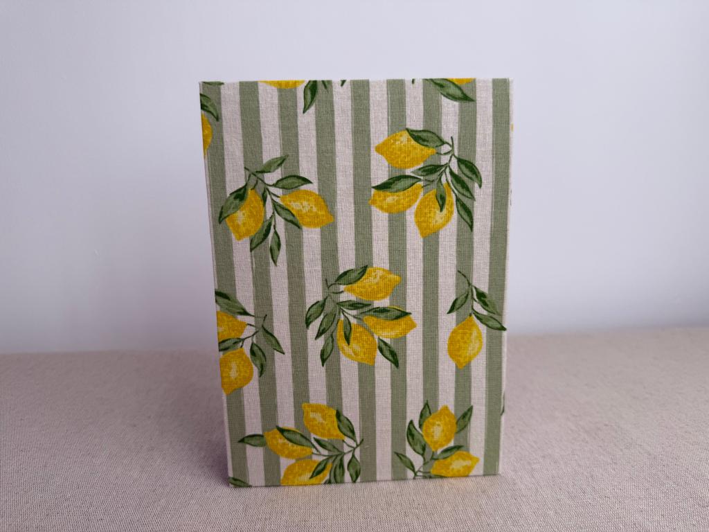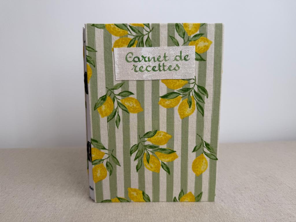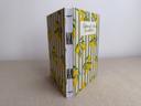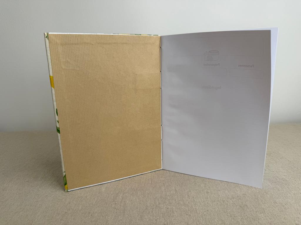 Couverture en carton recyclé rigide recouverte d’un tissu imprimé en coton et d’une étiquette calligraphiée au pinceau puis collée.