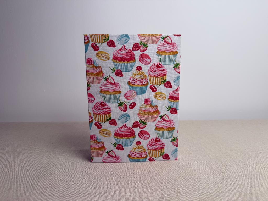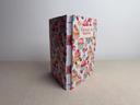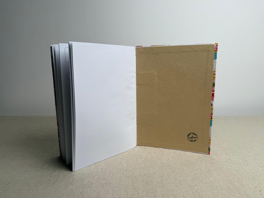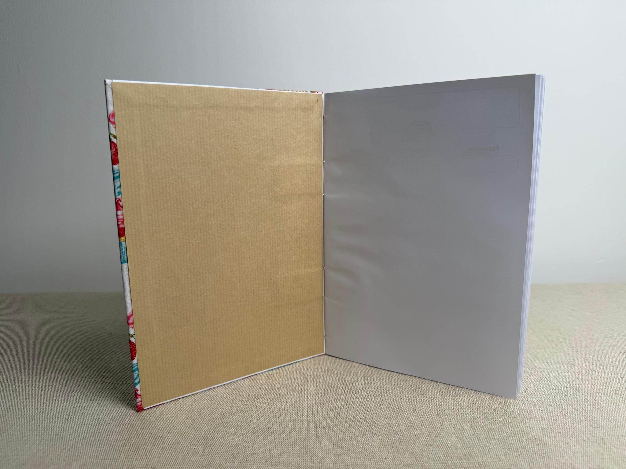 Couverture en carton recyclé rigide recouverte d’un tissu imprimé en coton et d’une étiquette calligraphiée au pinceau puis collée.