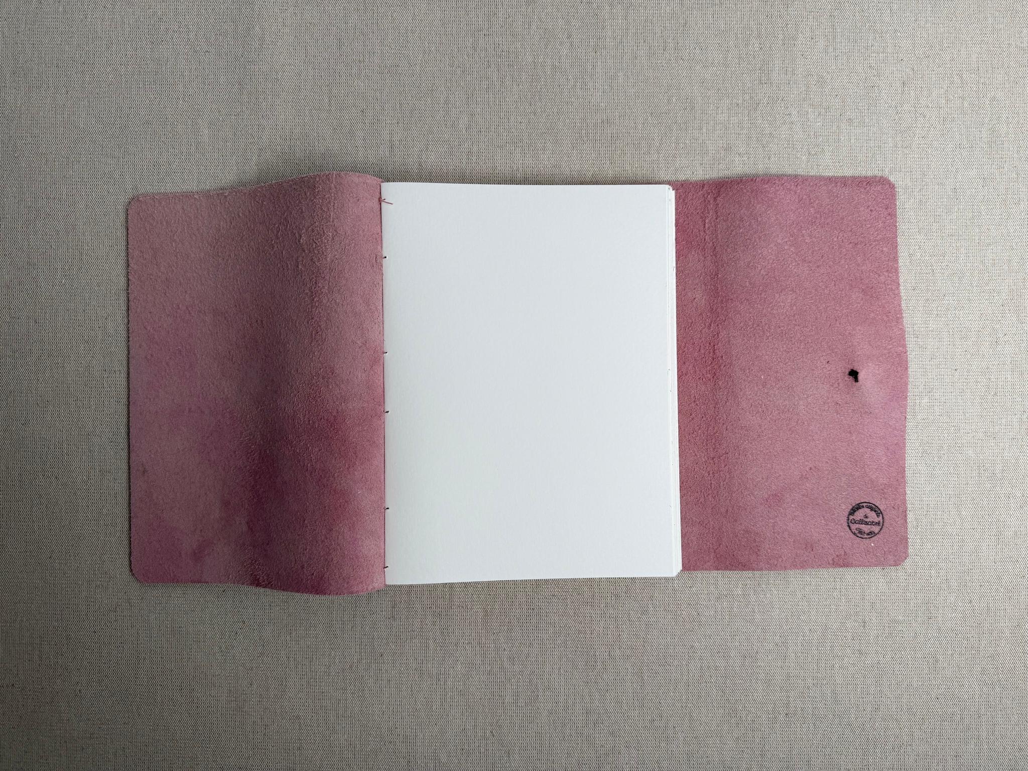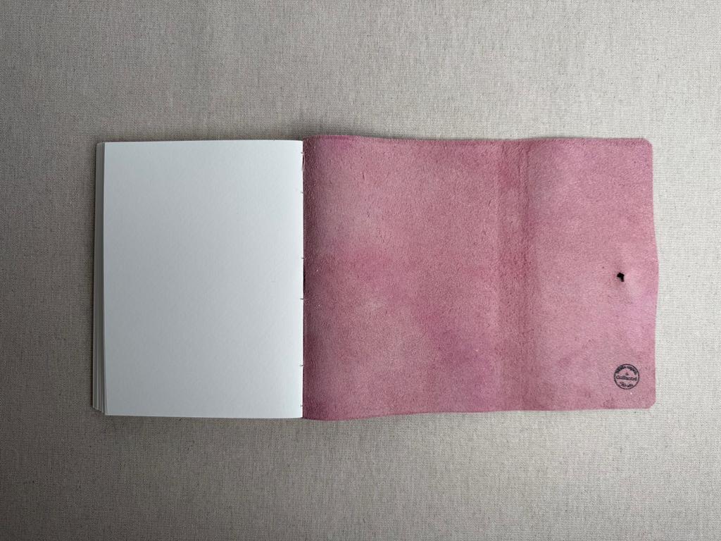 Carnet artisanal en cuir contenant un beau papier à dessin blanc, à la surface texturée très épaisse 220 g/m2 remarquable pour la peinture aquarelle.