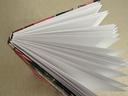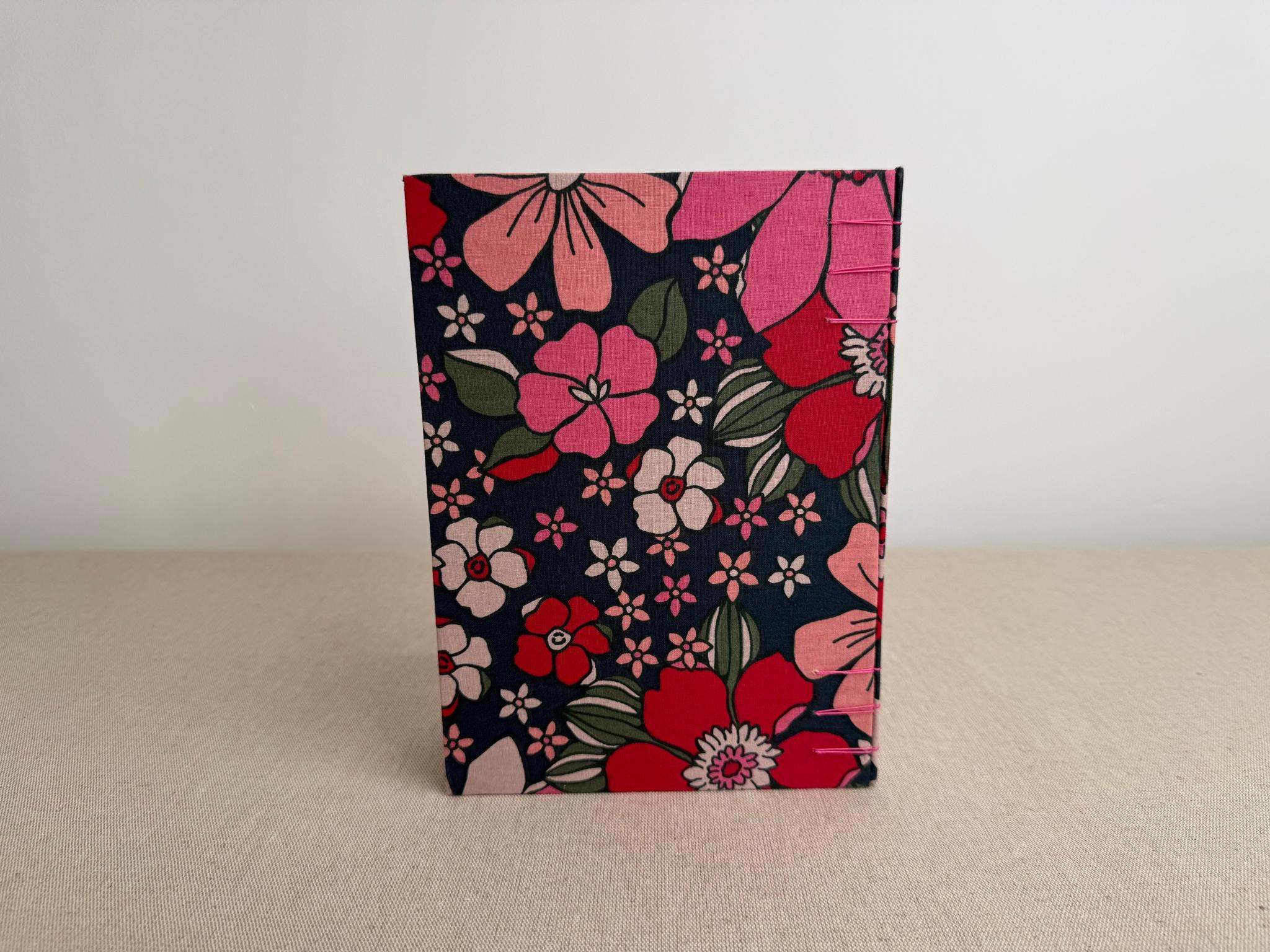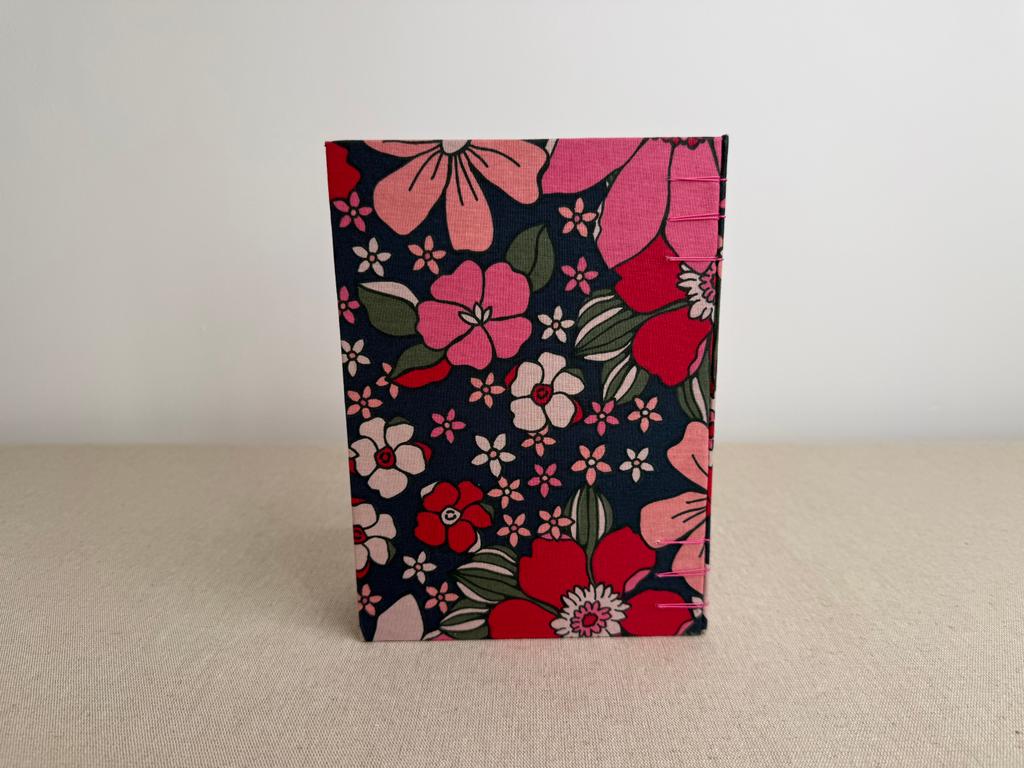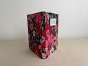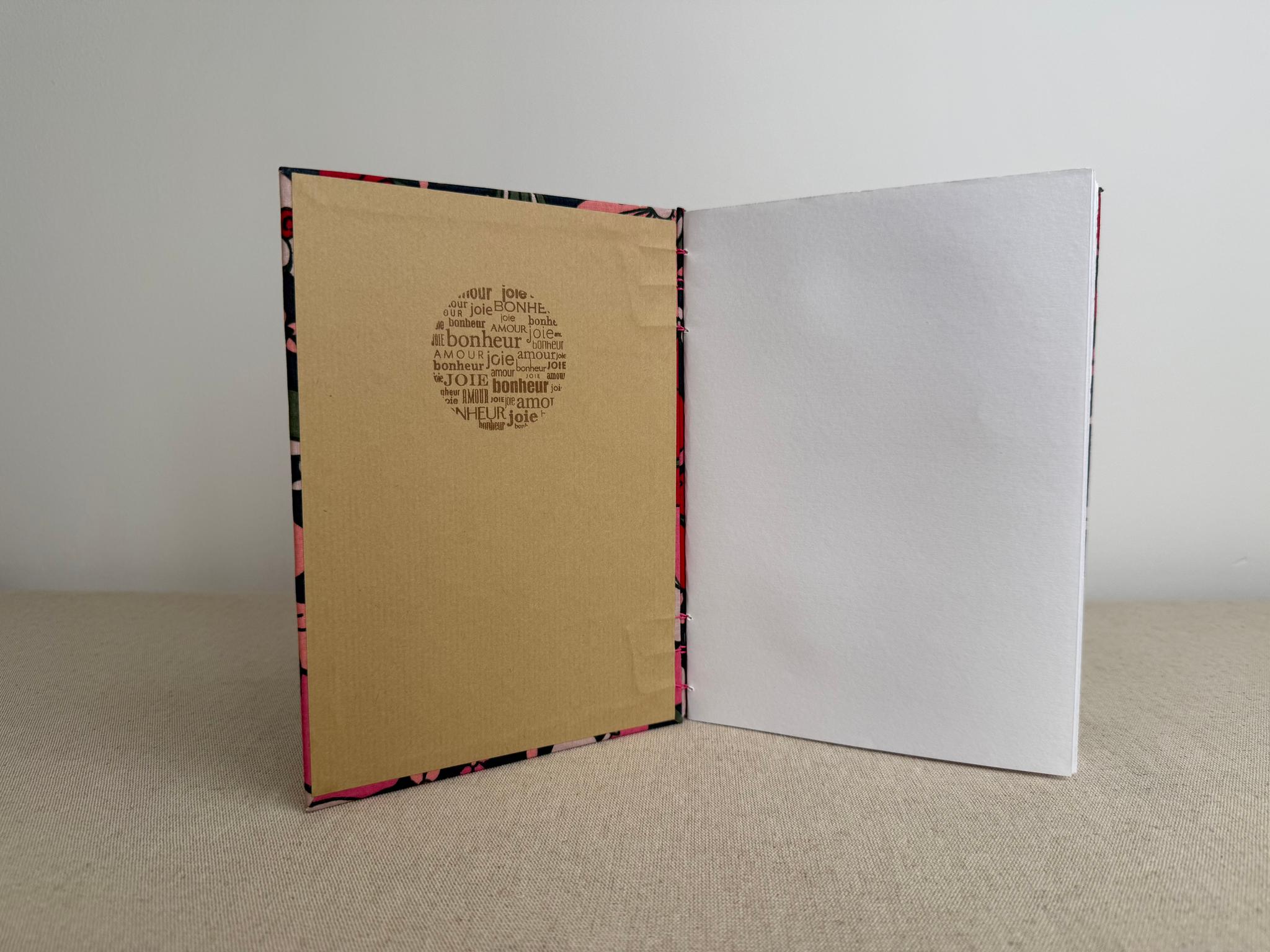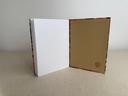 Couverture en carton recyclé rigide recouverte d’un tissu imprimé en coton et d’une étiquette calligraphiée au pinceau puis collée.