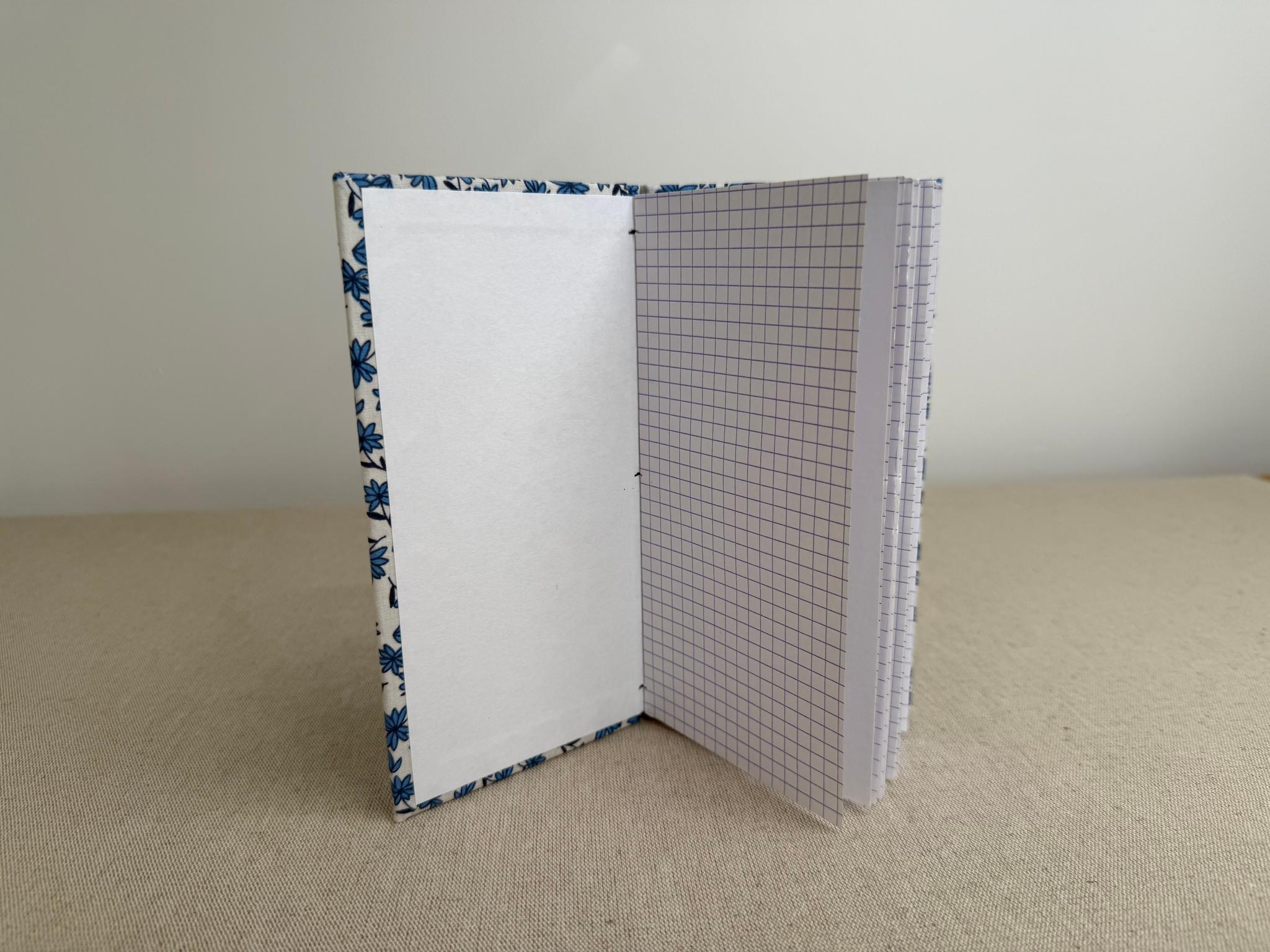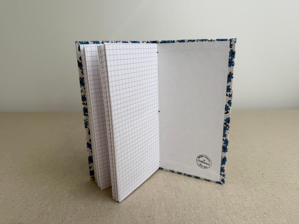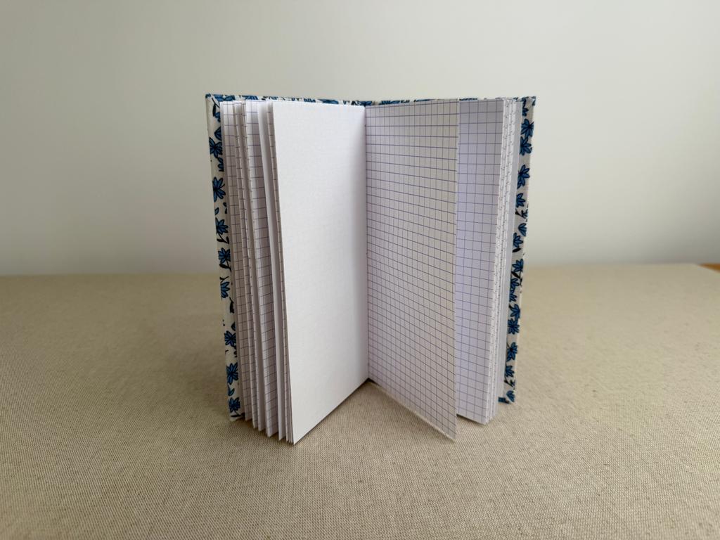 Carnet artisanal contenant du papier à dessin blanc Clairefontaine 120 g/m2 au grain fin et des feuilles de papier à petits carreaux 90 g/m2. Les feuilles blanches et à carreaux sont alternées, 12 feuilles blanches et 12 feuilles à carreaux.