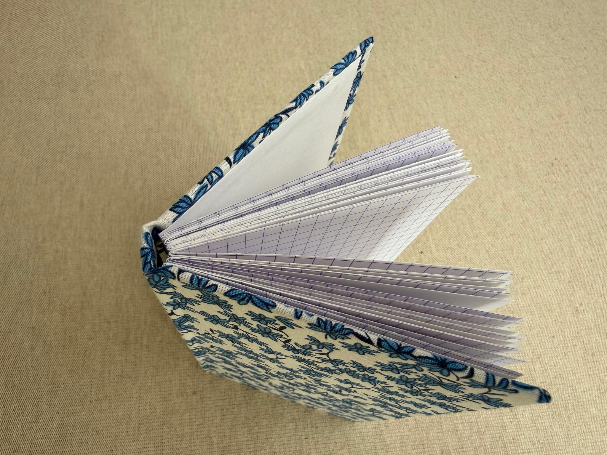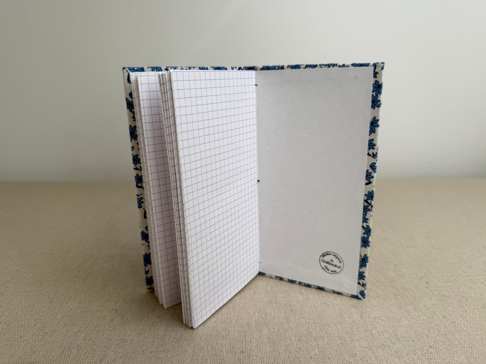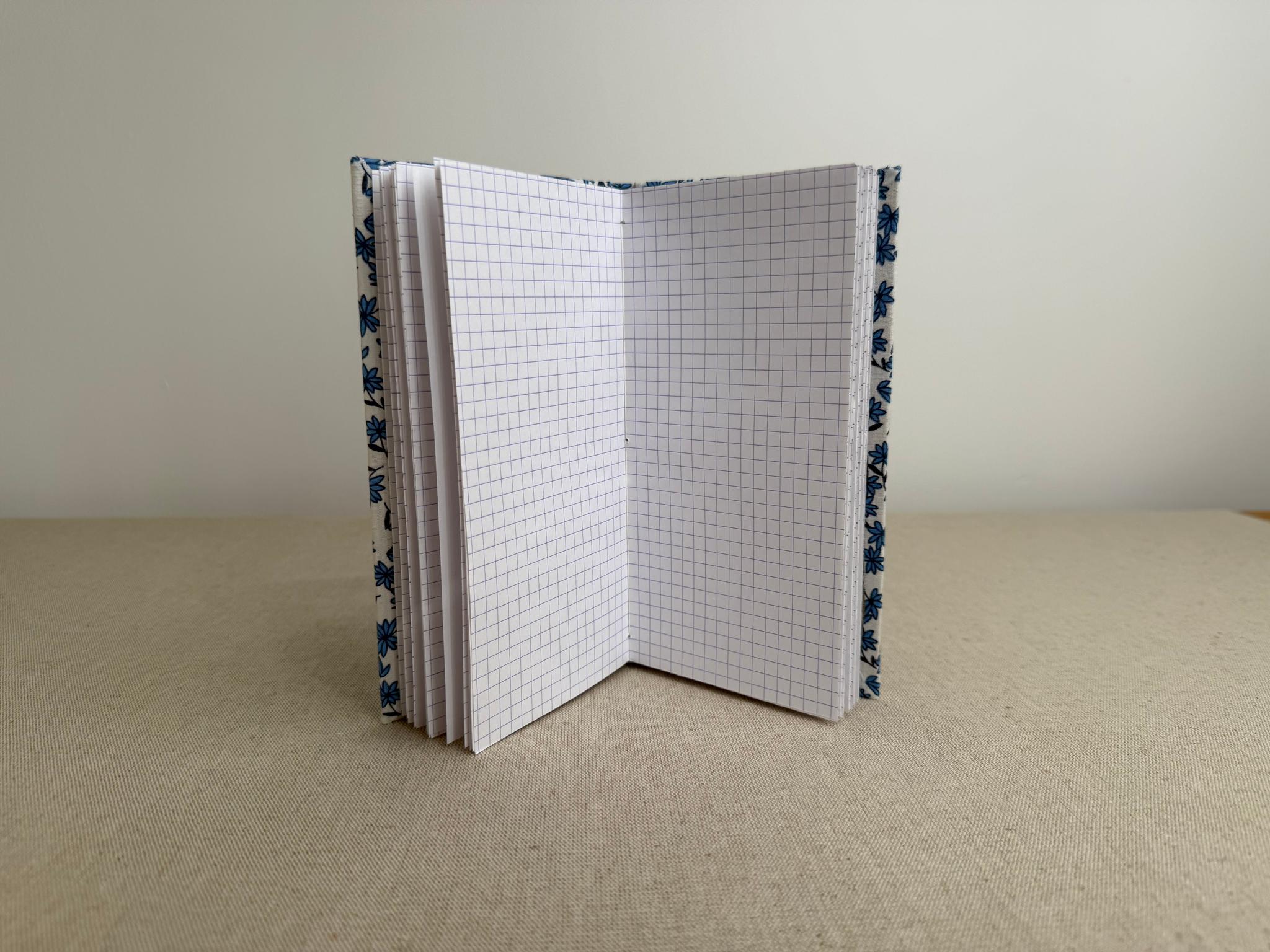 Carnet artisanal contenant du papier à dessin blanc Clairefontaine 120 g/m2 au grain fin et des feuilles de papier à petits carreaux 90 g/m2. Les feuilles blanches et à carreaux sont alternées, 12 feuilles blanches et 12 feuilles à carreaux.