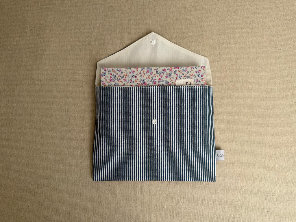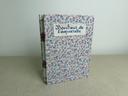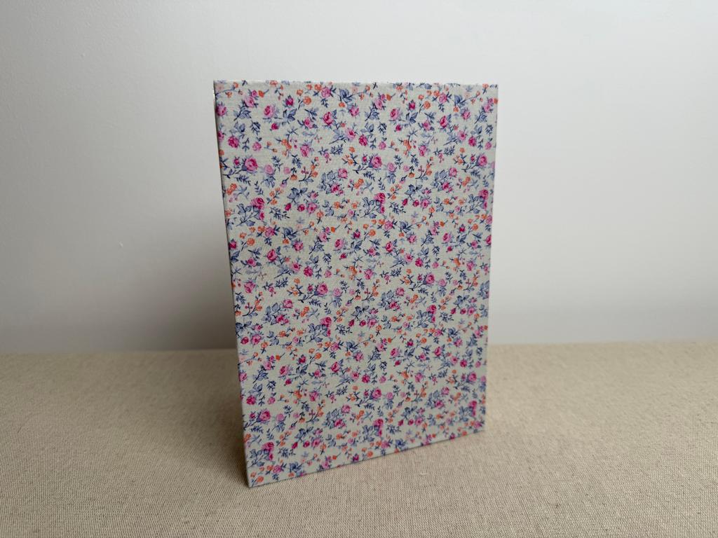 Couverture en carton recyclé rigide recouverte d’un tissu imprimé en coton et d’une étiquette calligraphiée au pinceau puis collée.