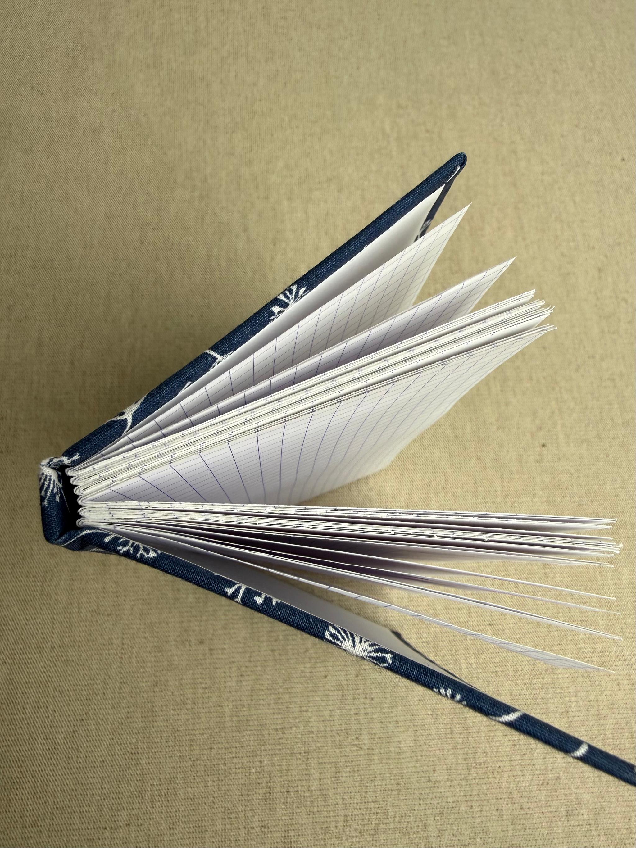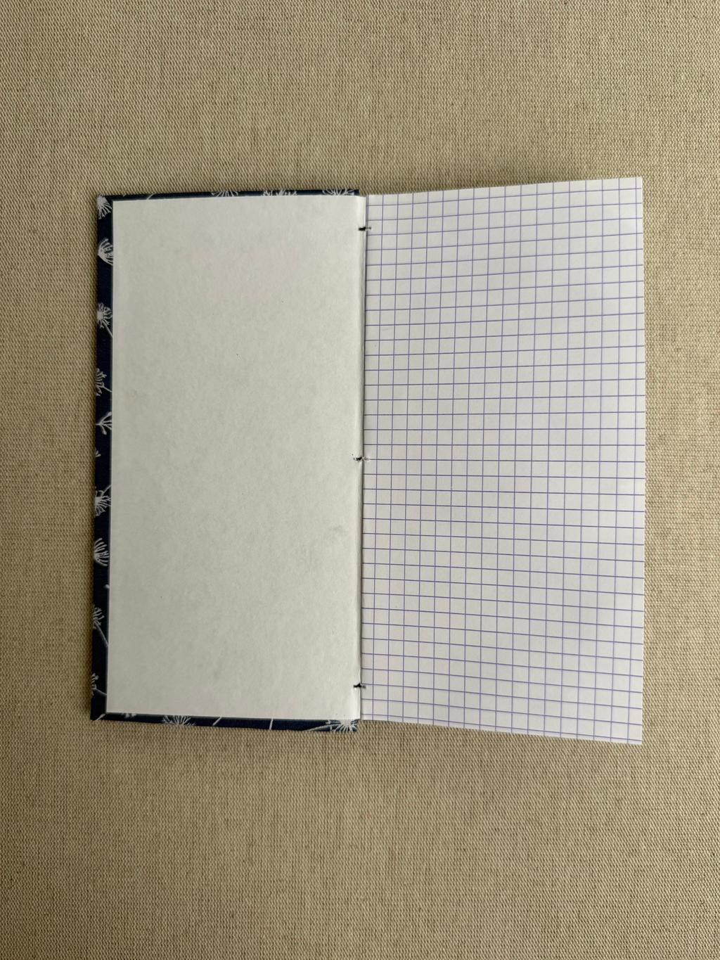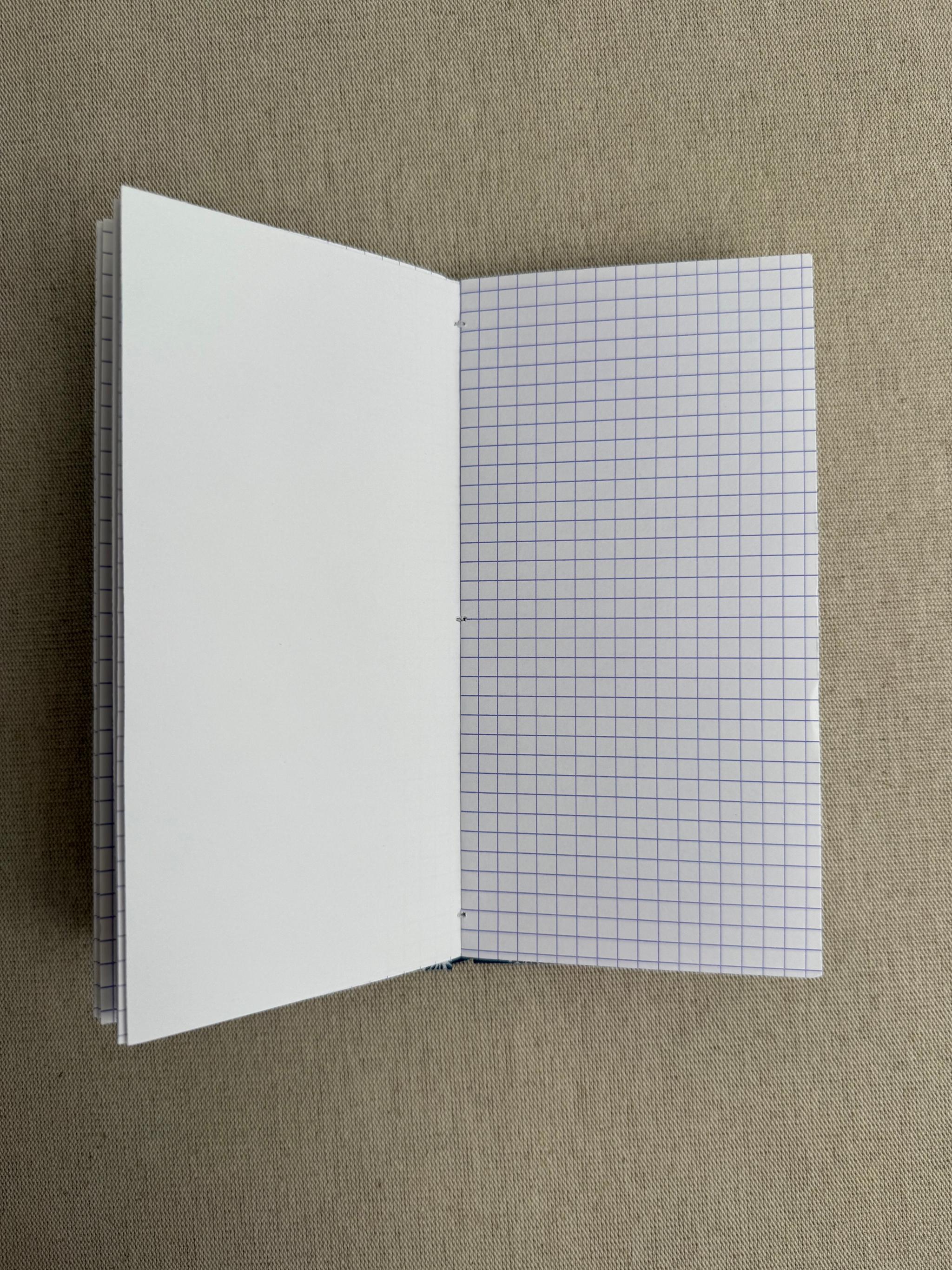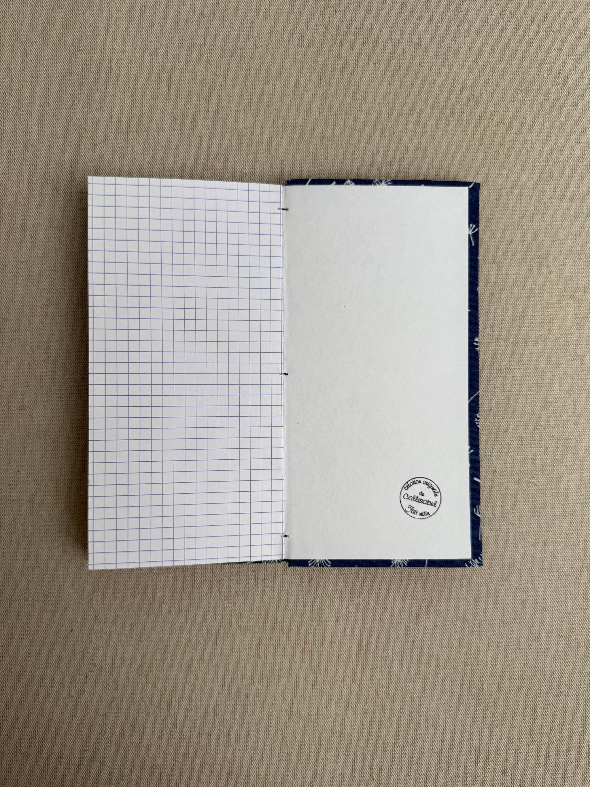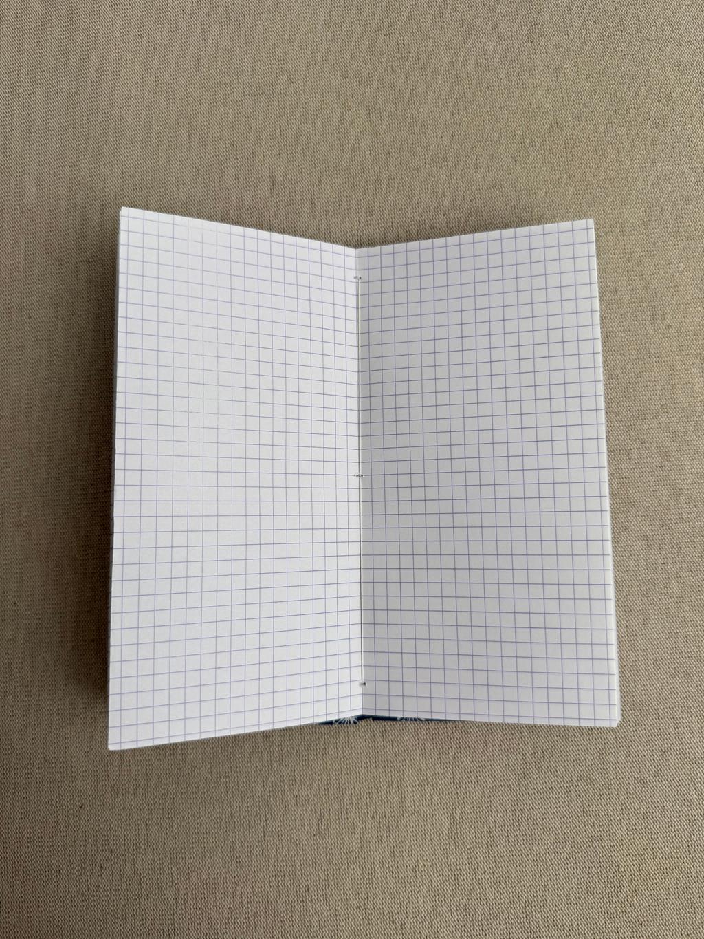 Carnet artisanal contenant du papier à dessin blanc Clairefontaine 120 g/m2 au grain fin et des feuilles de papier à petits carreaux 90 g/m2. Les feuilles blanches et à carreaux sont alternées, 12 feuilles blanches et 12 feuilles à carreaux.