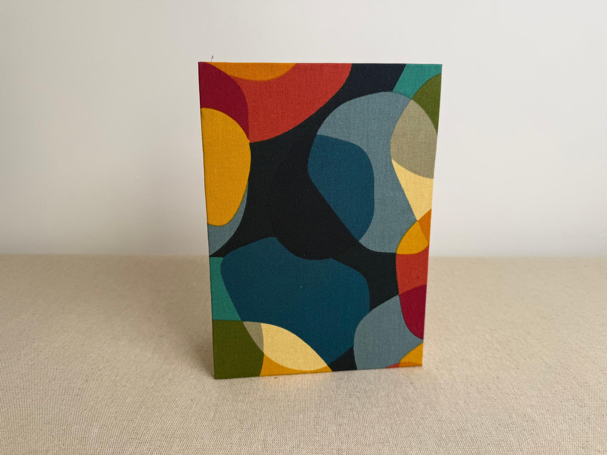 Couverture en carton recyclé rigide recouverte d’un tissu imprimé en coton et d’une étiquette calligraphiée au pinceau puis collée.