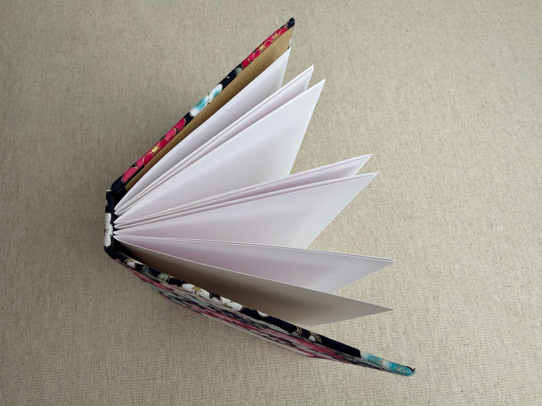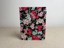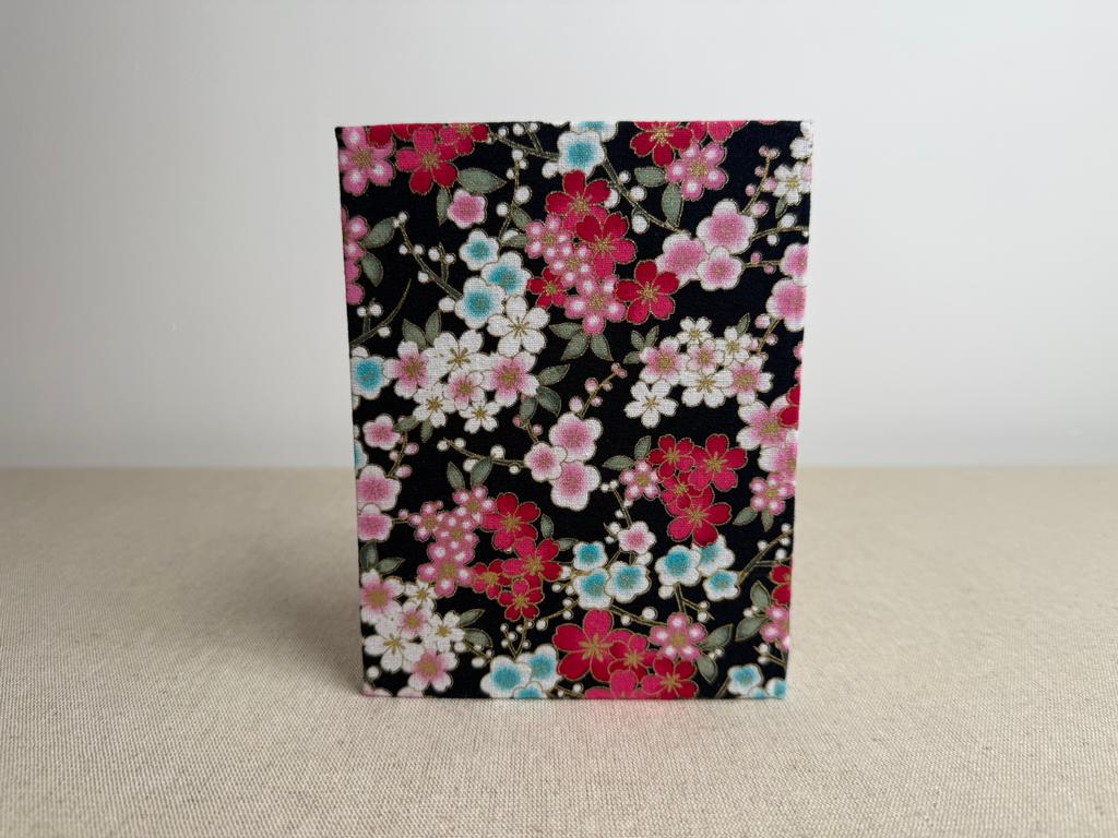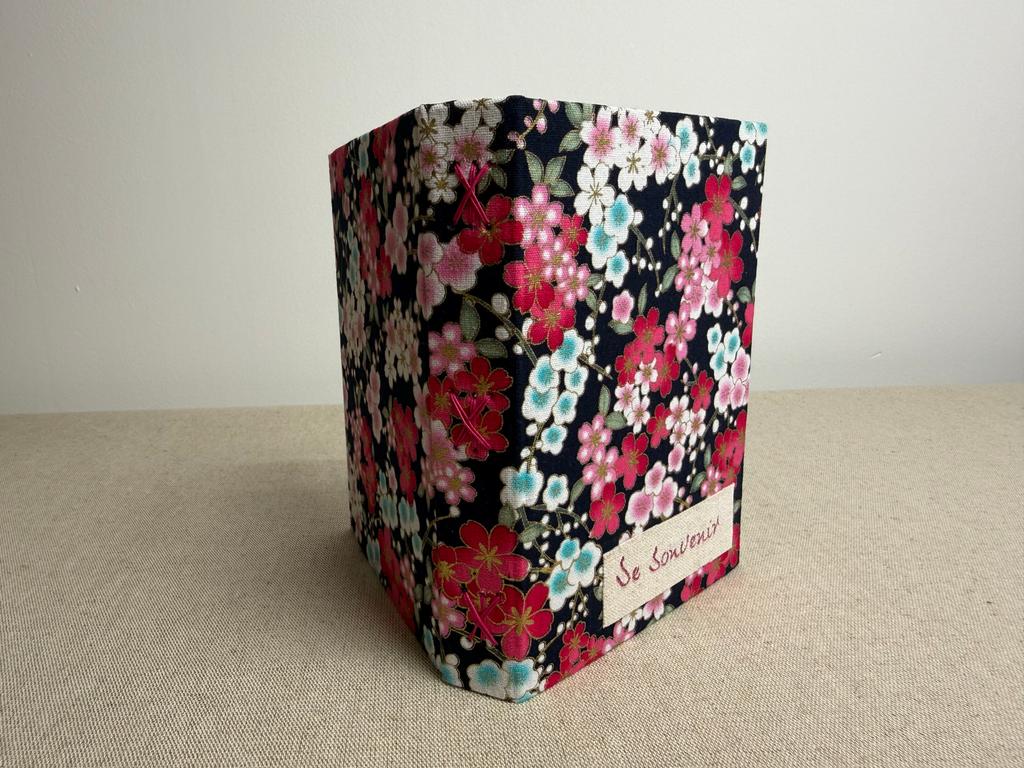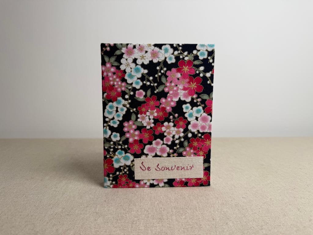 Couverture en carton recyclé rigide recouverte d’un tissu imprimé en coton et d’une étiquette calligraphiée au pinceau puis collée.