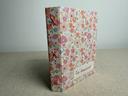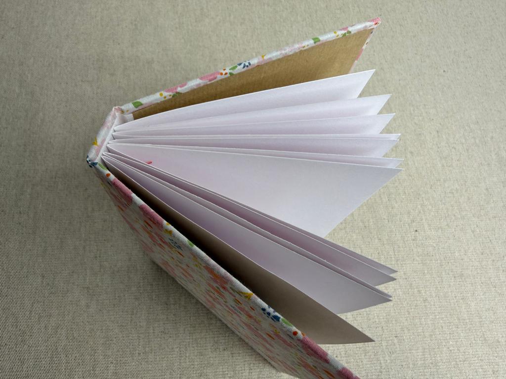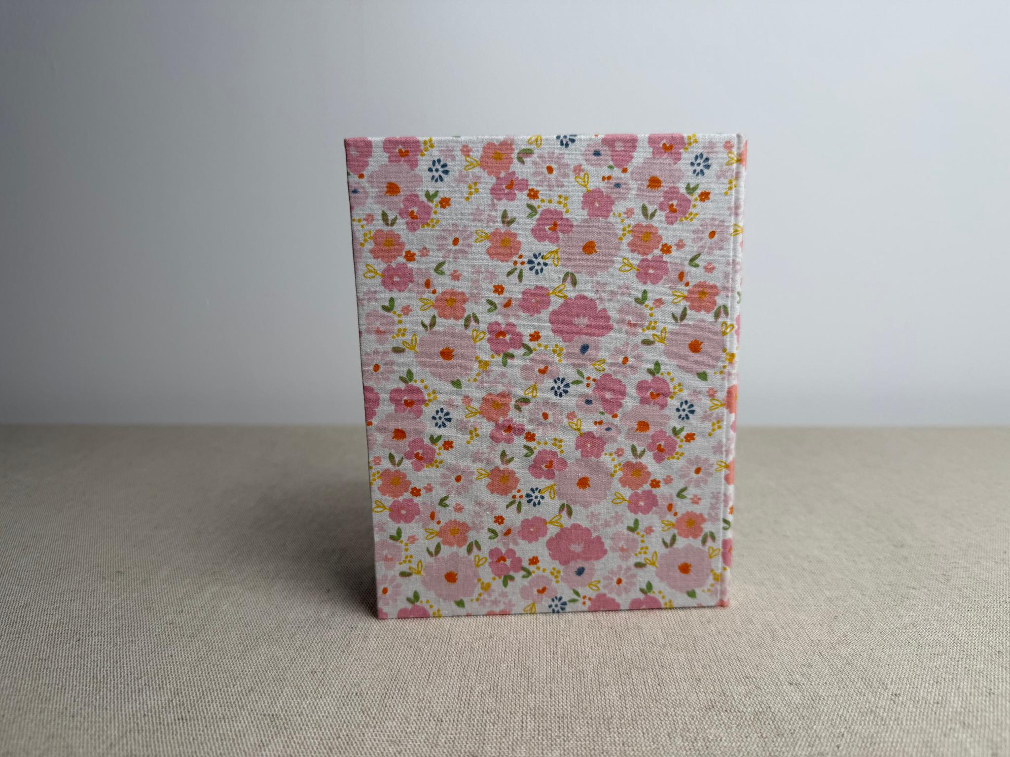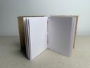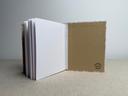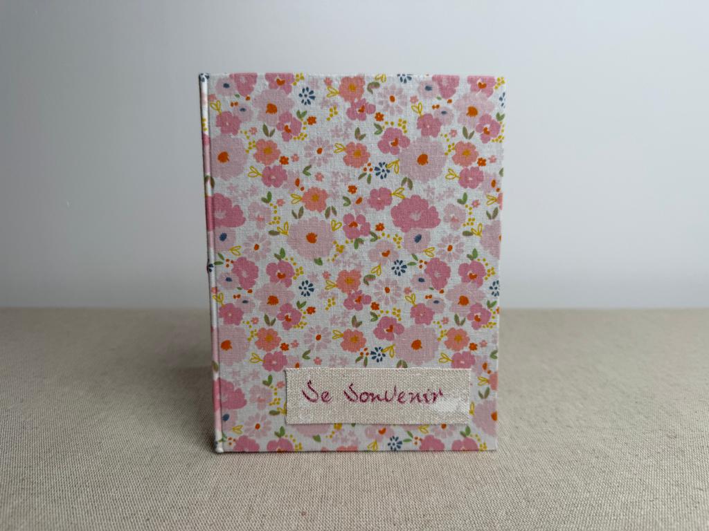 Couverture en carton recyclé rigide recouverte d’un tissu imprimé en coton et d’une étiquette calligraphiée au pinceau puis collée.