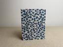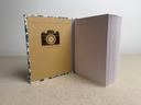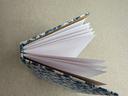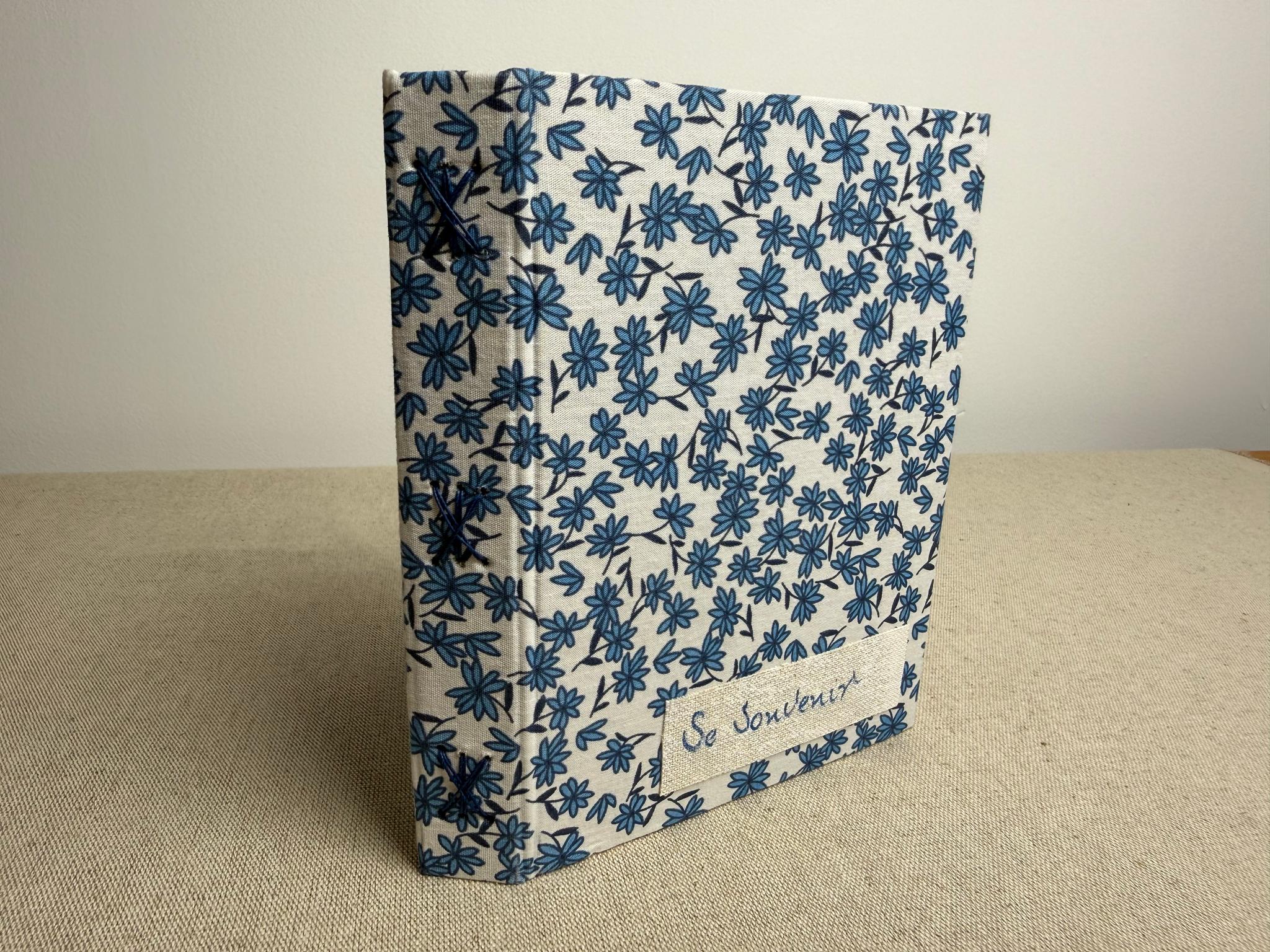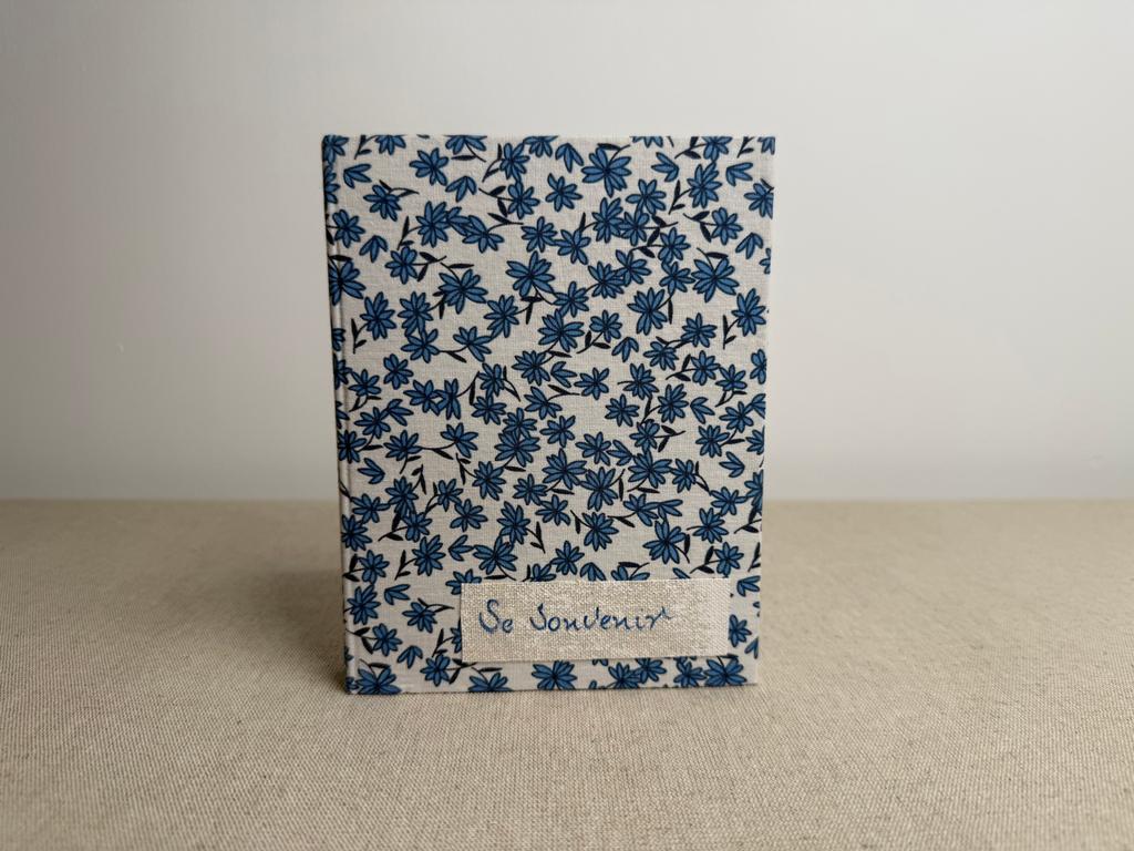 Couverture en carton recyclé rigide recouverte d’un tissu imprimé en coton et d’une étiquette calligraphiée au pinceau puis collée.