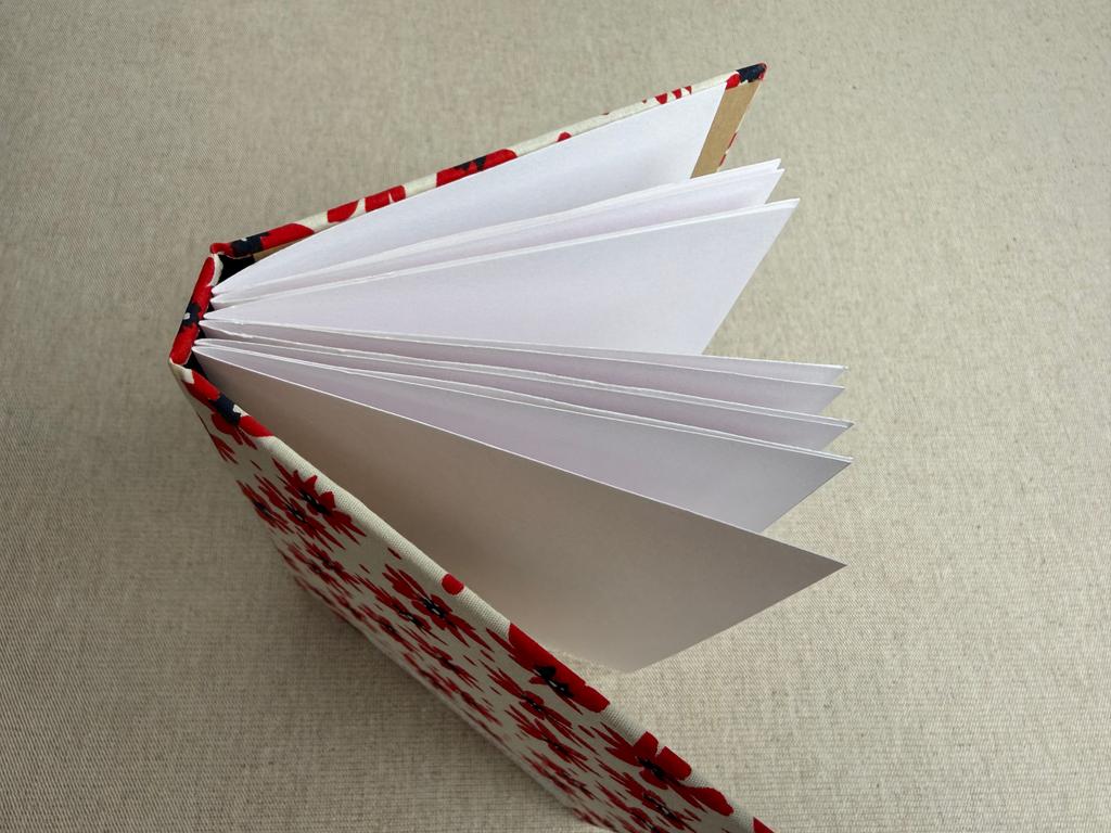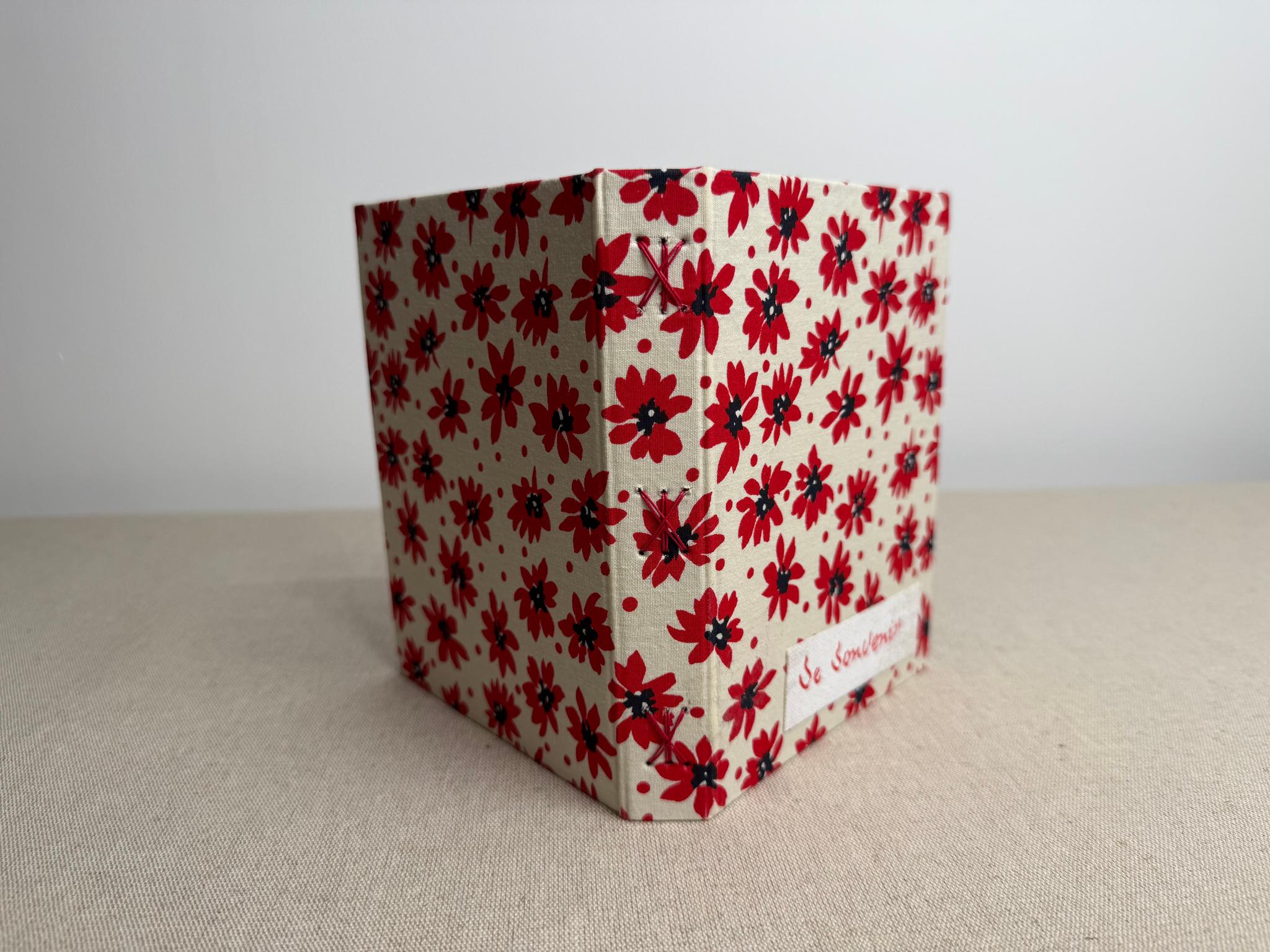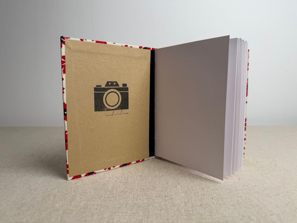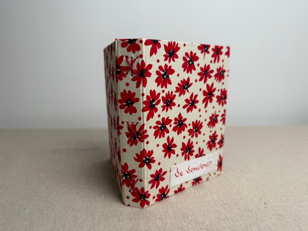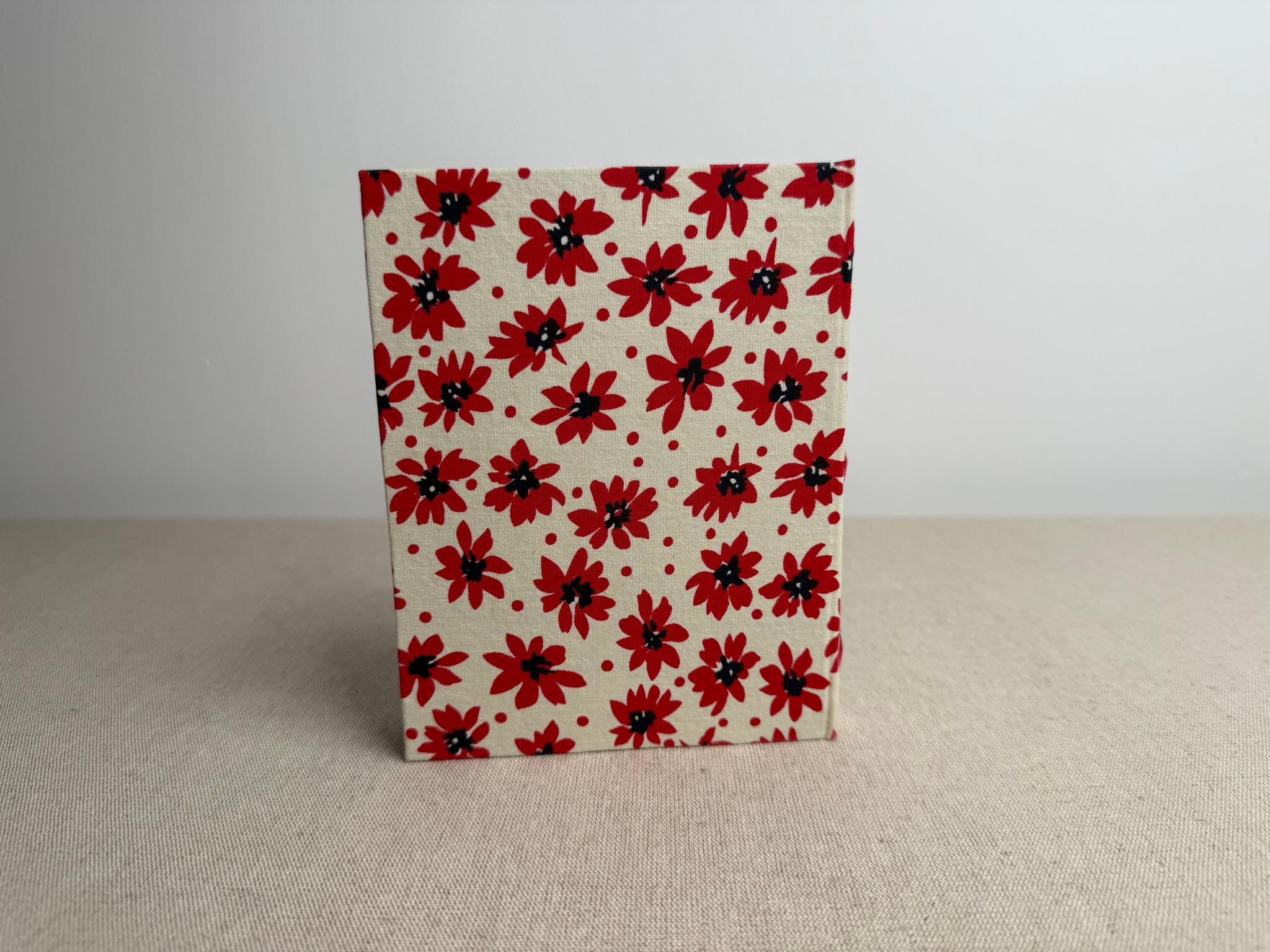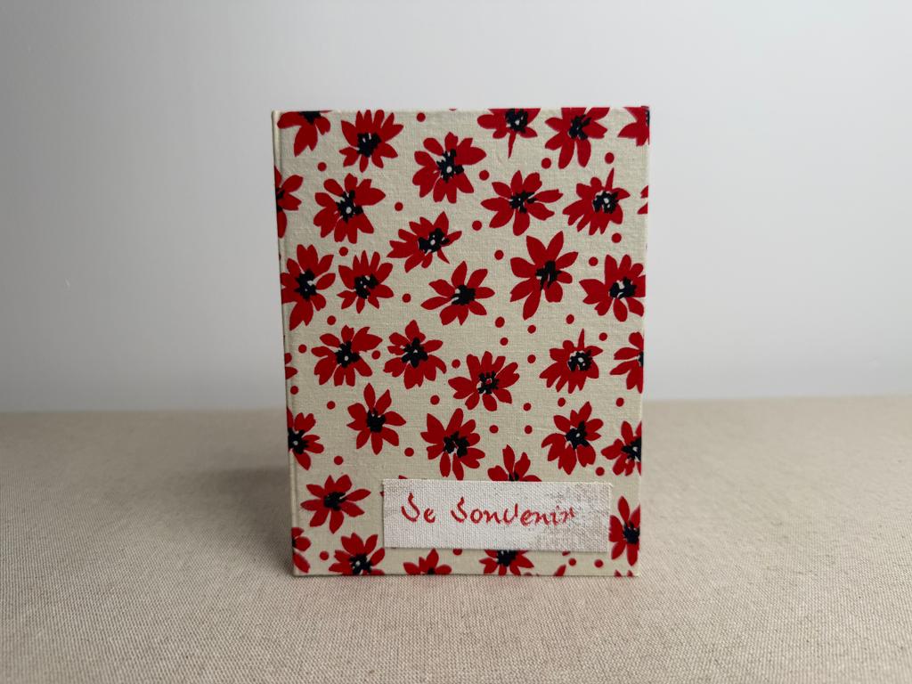 Couverture en carton recyclé rigide recouverte d’un tissu imprimé en coton et d’une étiquette calligraphiée au pinceau puis collée.