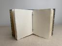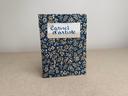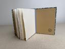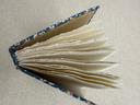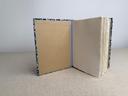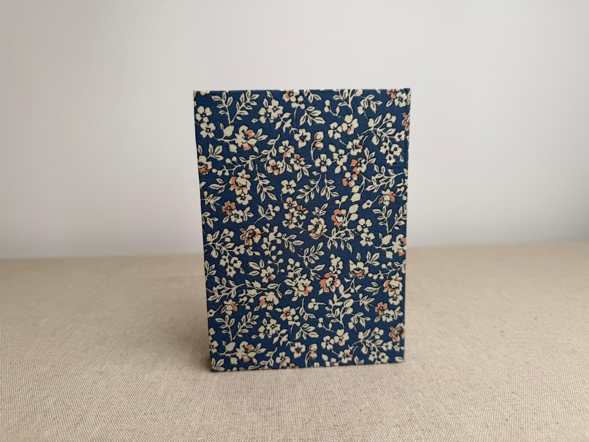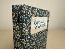Couverture en carton recyclé rigide recouverte d’un tissu imprimé en coton et d’une étiquette calligraphiée au pinceau puis collée.