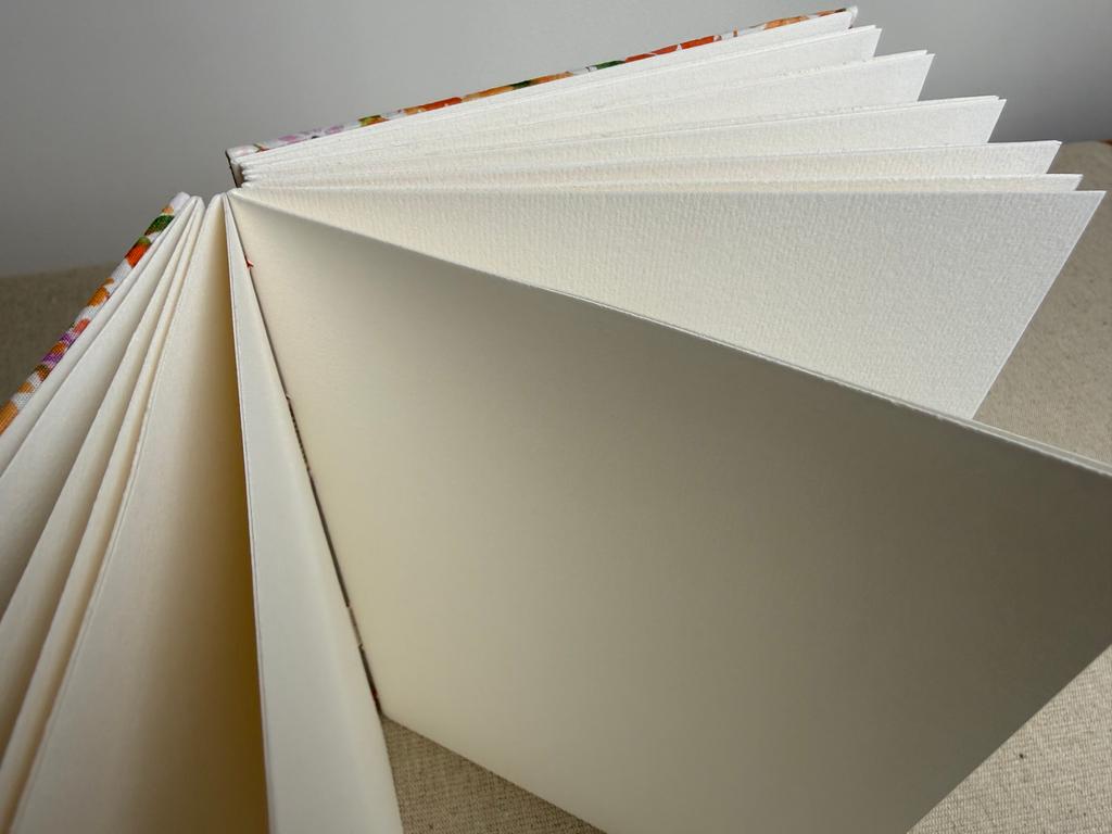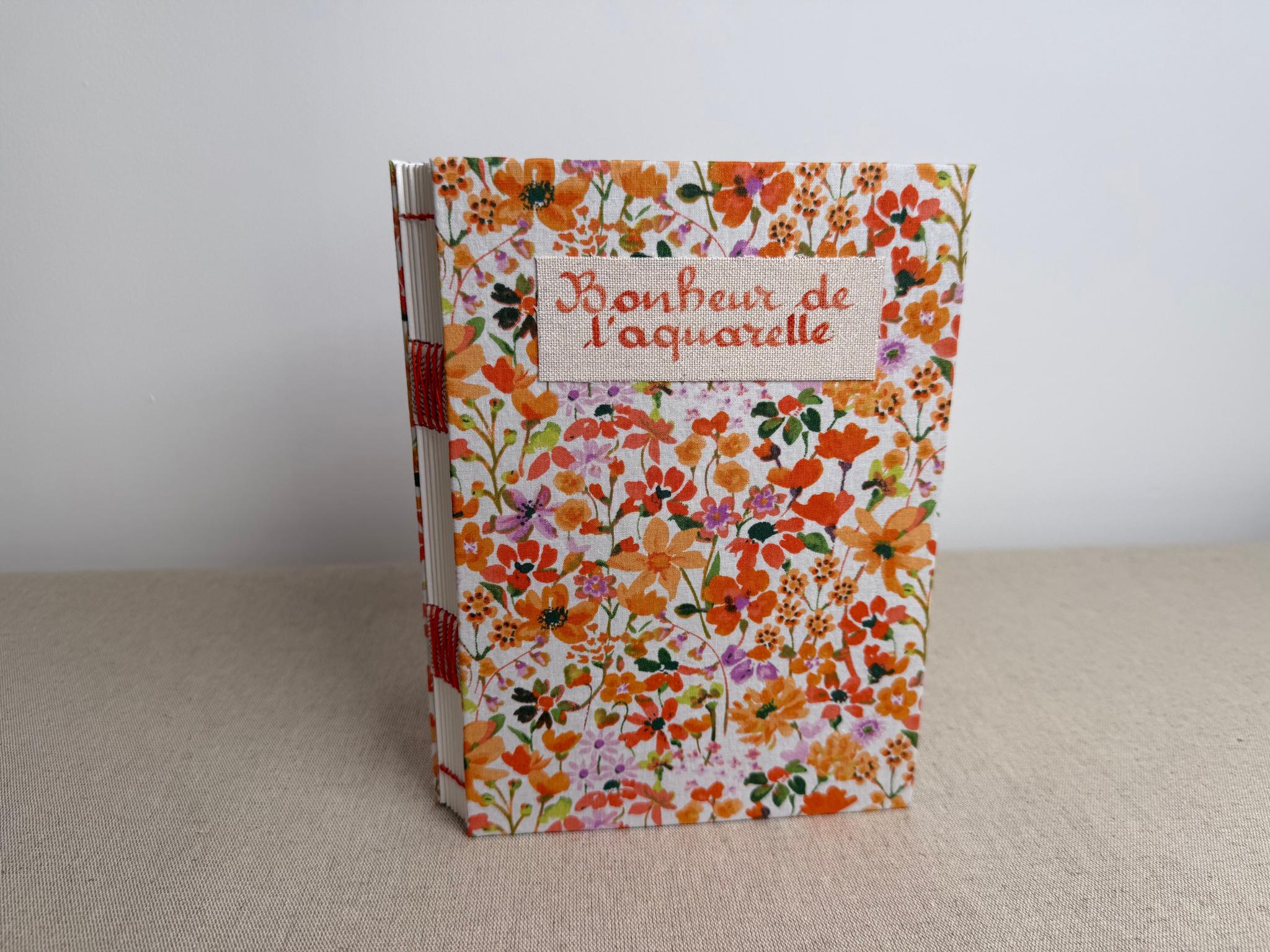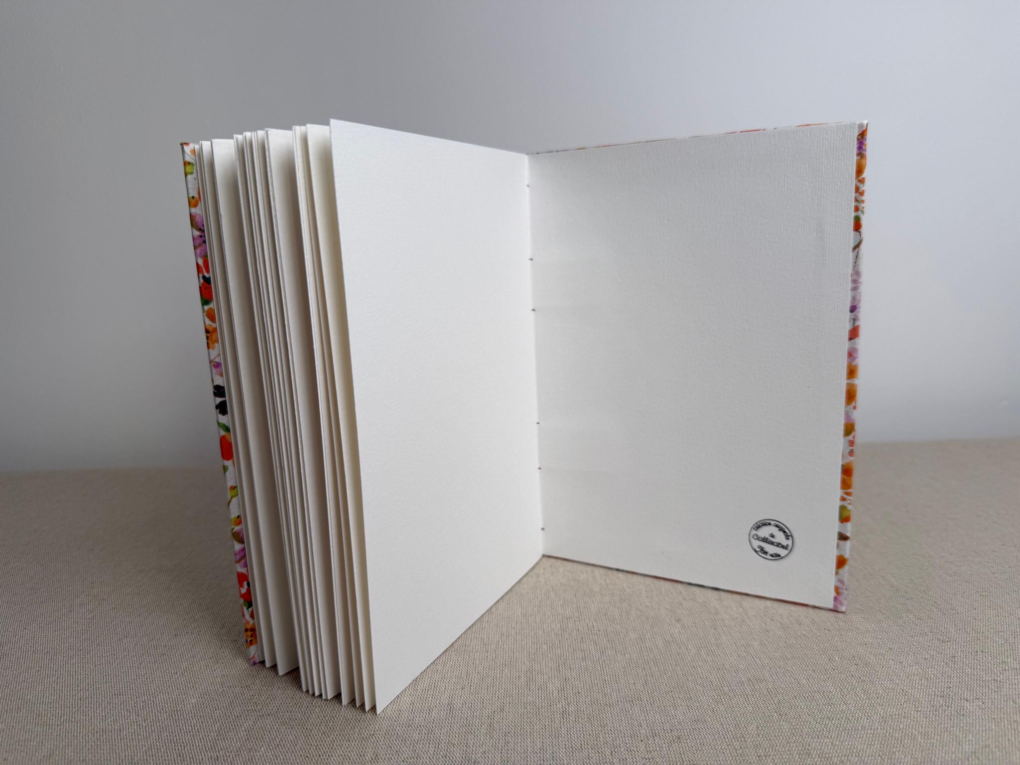 Carnet artisanal avec un très beau papier aquarelle épais de 225 g/m2, contenant 10 % de coton, avec une légère surface granuleuse. Les couleurs y adhérent parfaitement, même les tons doux, avec une dispersion légère.