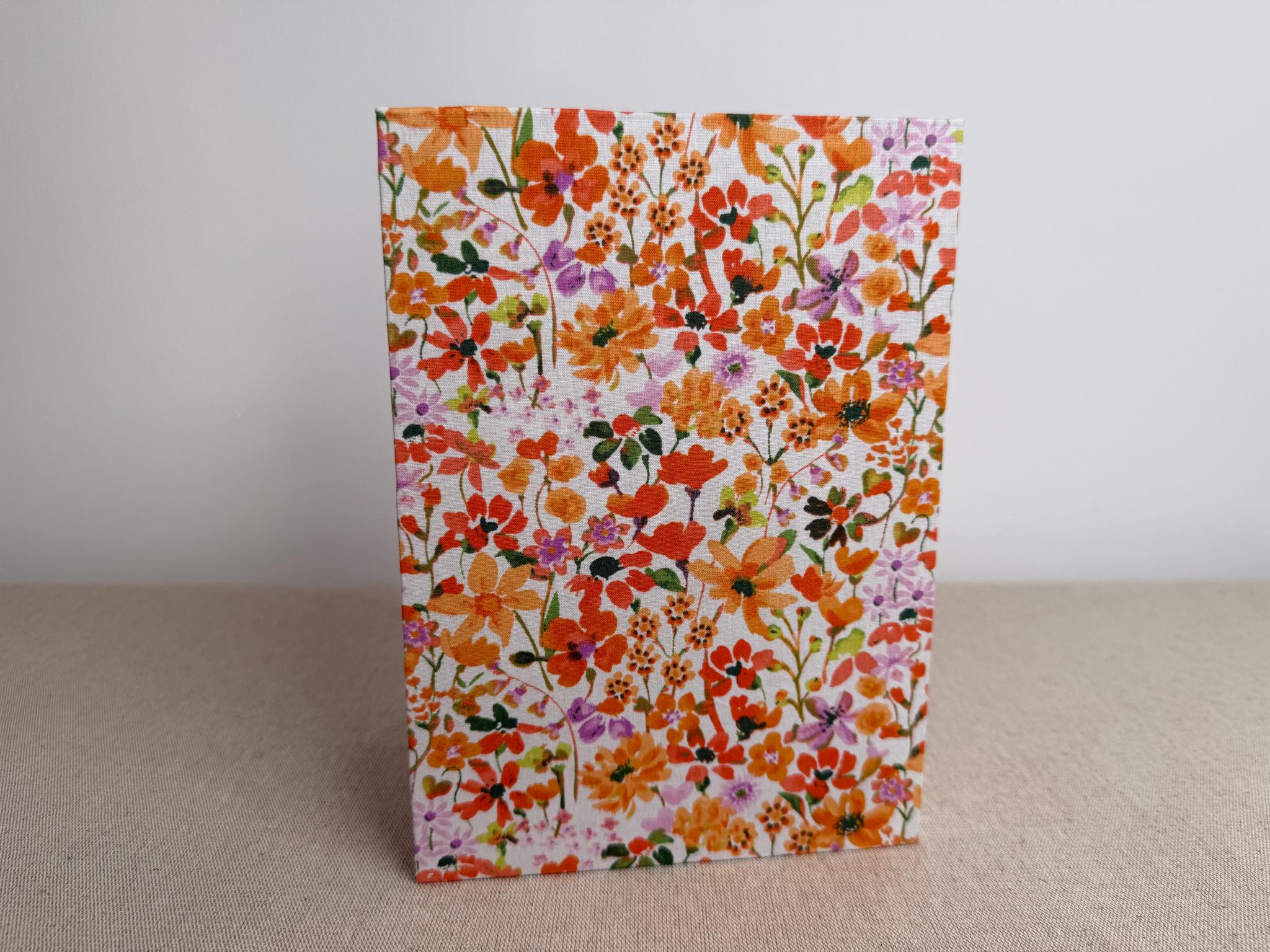 Couverture en carton recyclé rigide recouverte d’un tissu imprimé en coton et d’une étiquette calligraphiée au pinceau puis collée.