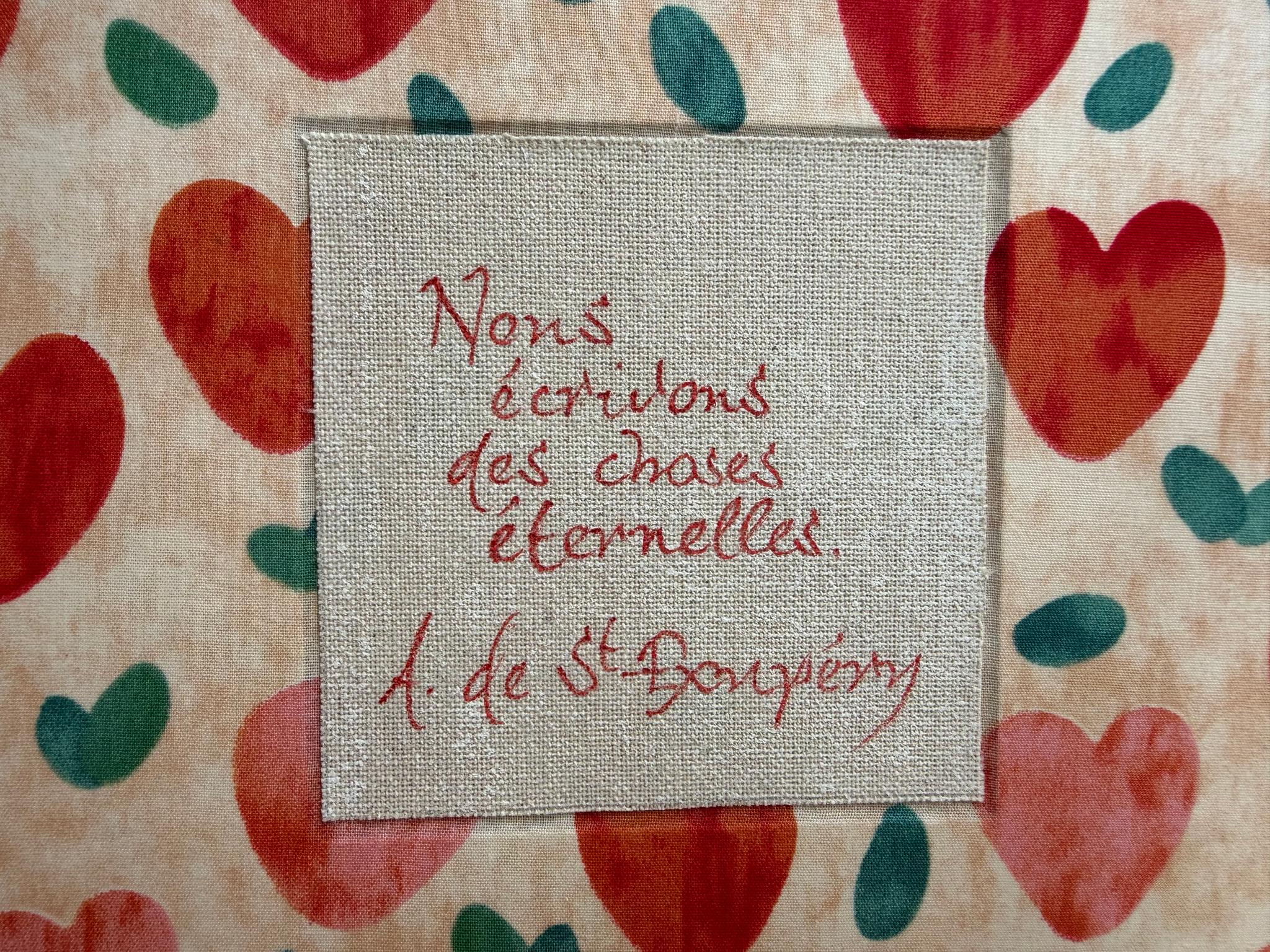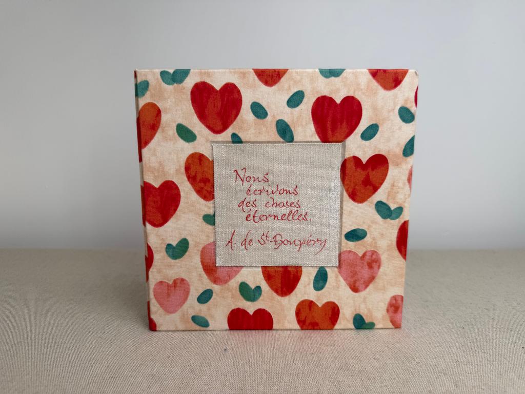 Cet article est unique, il a été fabriqué à la main par mes propres soins dans mon atelier de la région lyonnaise. Je fabrique habituellement par séries d’une dizaine d’articles du même type (même forme, même dimensions), mais aucun n’est identique : tous ont quelque chose de différent, que ce soit au niveau des couleurs, du texte calligraphié ou même de l’orientation des tissus. C’est pour cela que mes articles vendus en ligne sont numérotés. En savoir plus