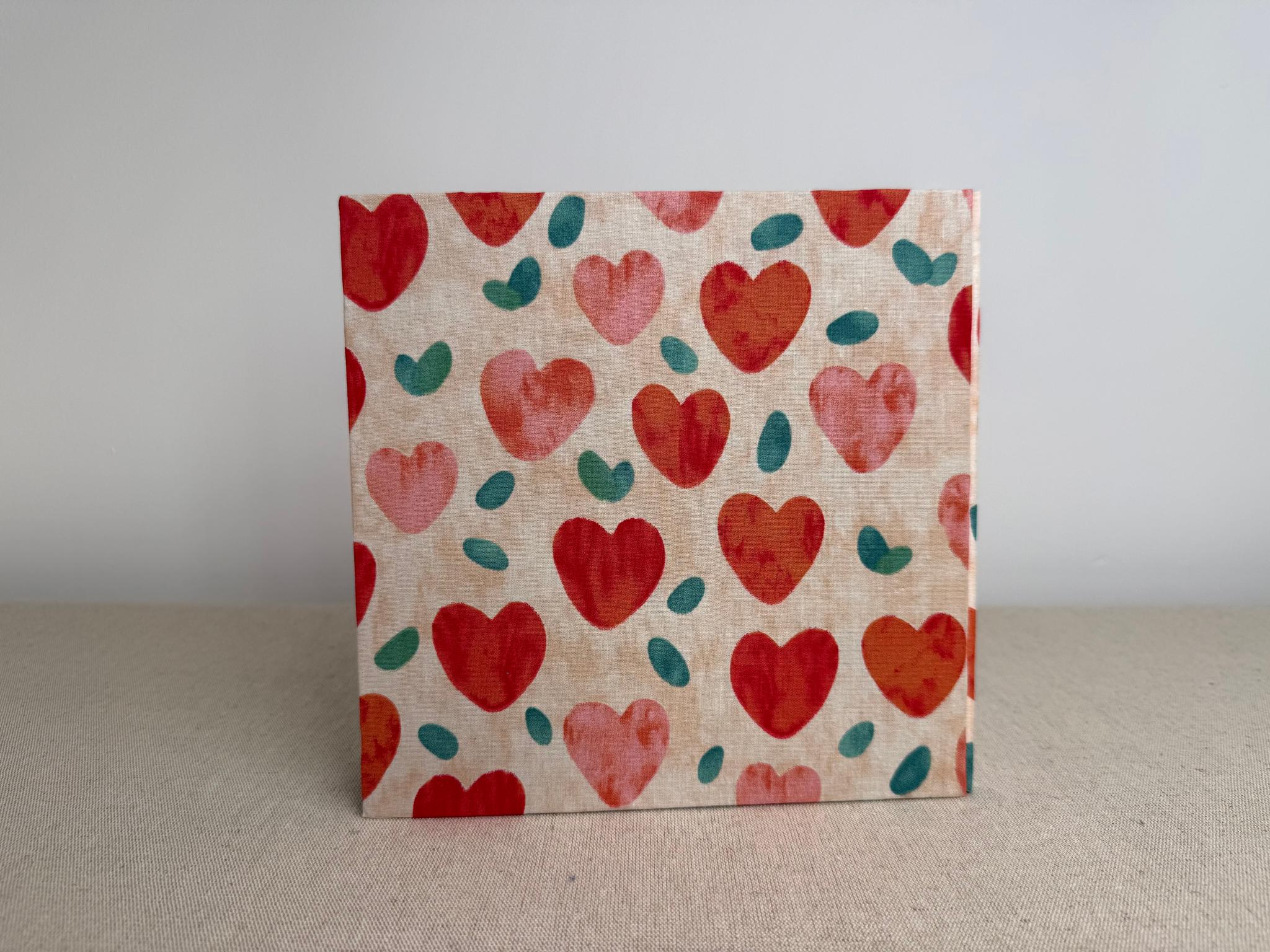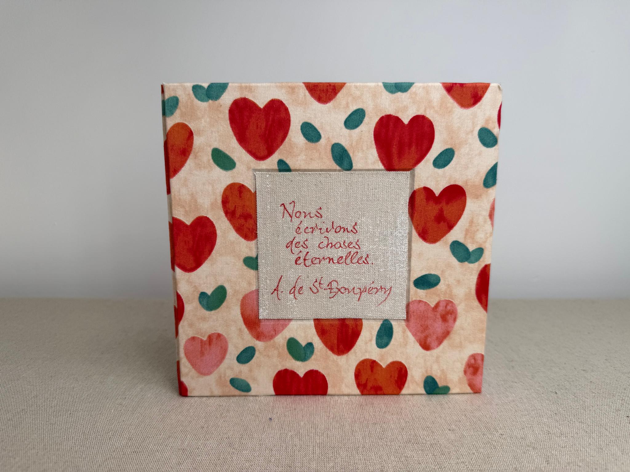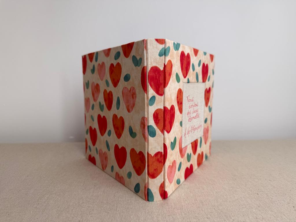 Couverture en carton recyclé rigide recouverte d’un tissu imprimé en coton avec son étiquette en tissu calligraphiée à l’encre indélébile puis collée.