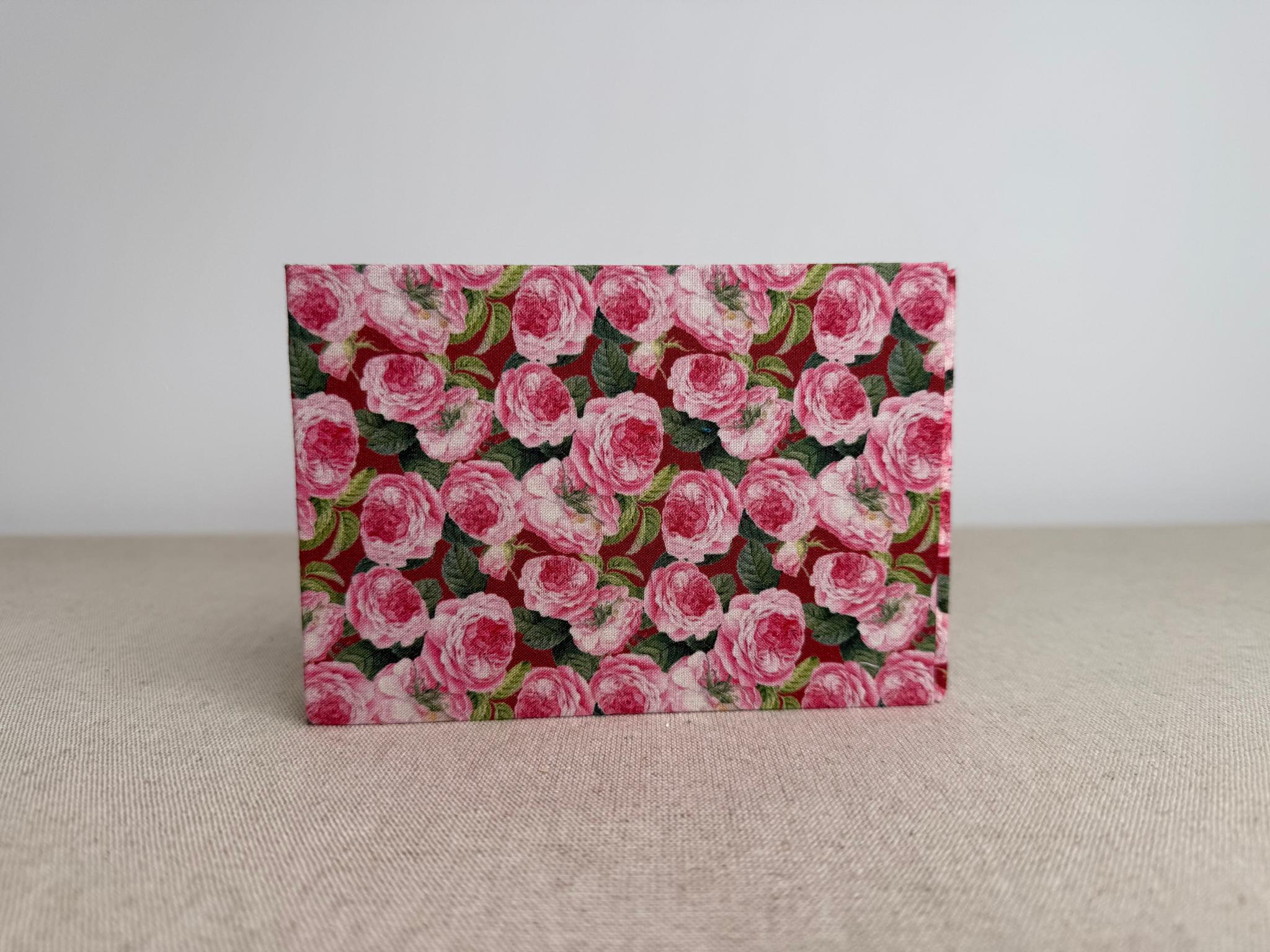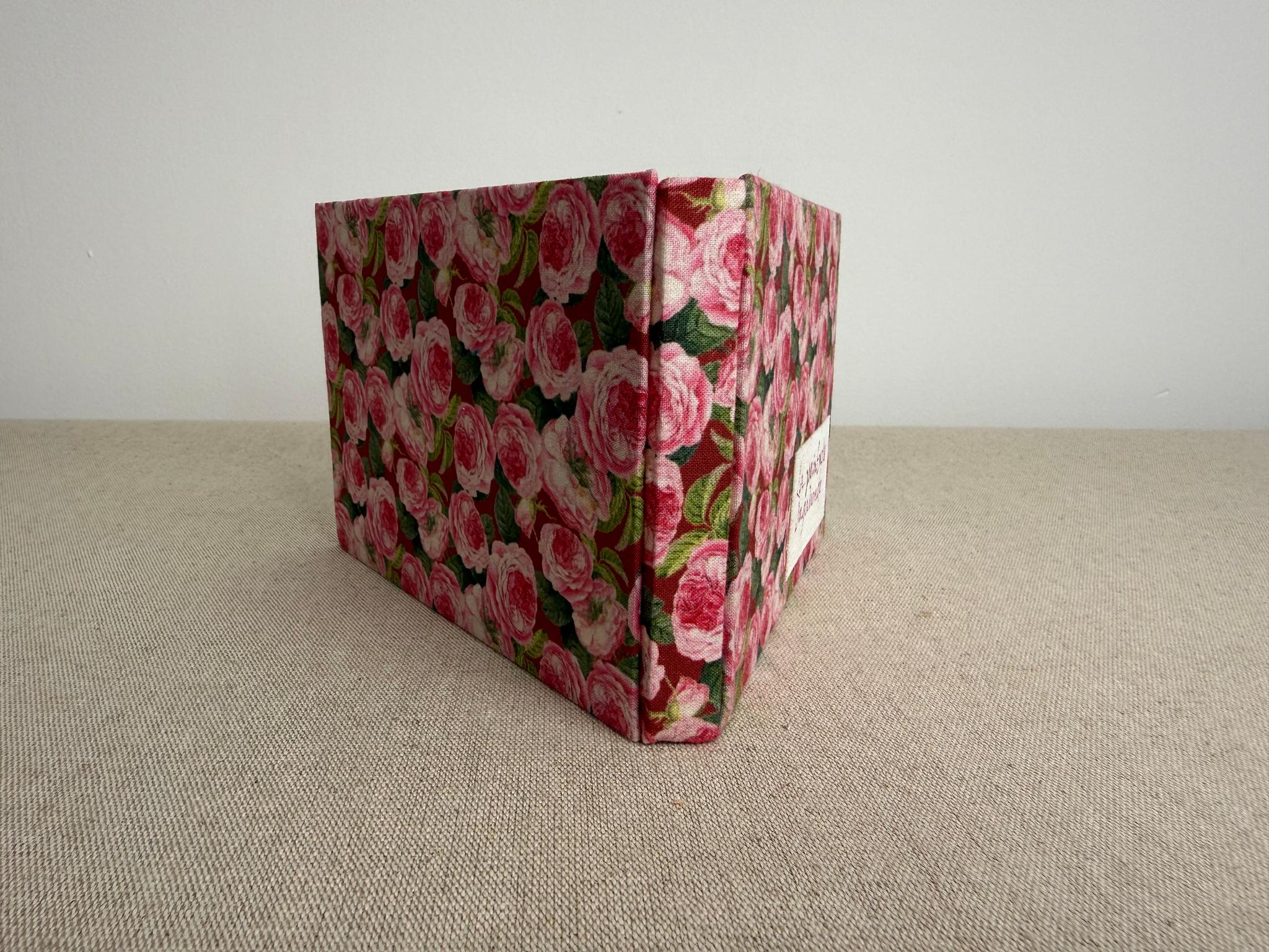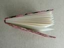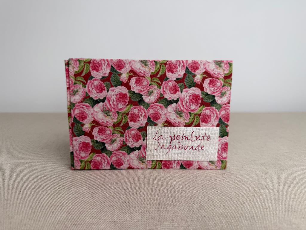 Couverture en carton recyclé rigide recouverte d’un tissu imprimé en coton et d’une étiquette calligraphiée au pinceau puis collée.