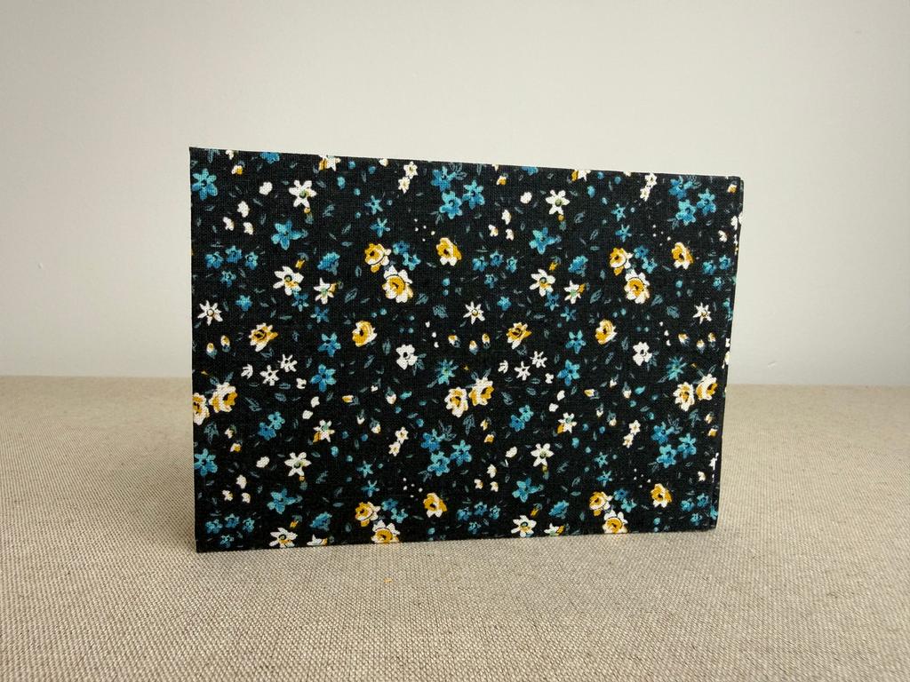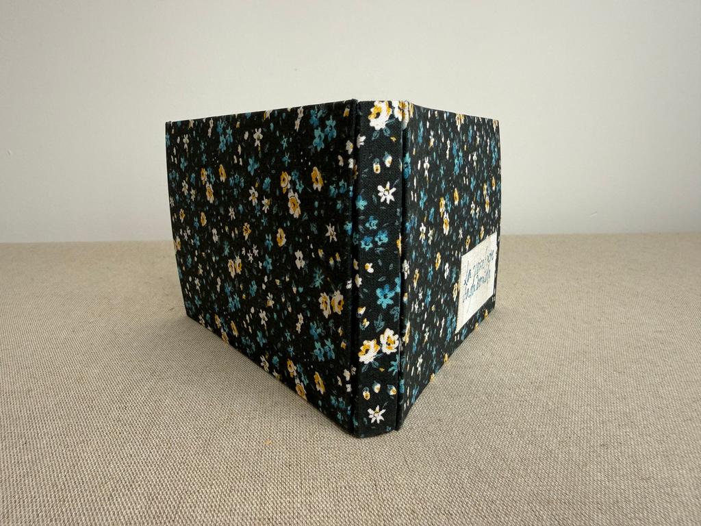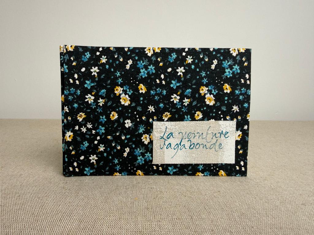 Couverture en carton recyclé rigide recouverte d’un tissu imprimé en coton et d’une étiquette calligraphiée au pinceau puis collée.
