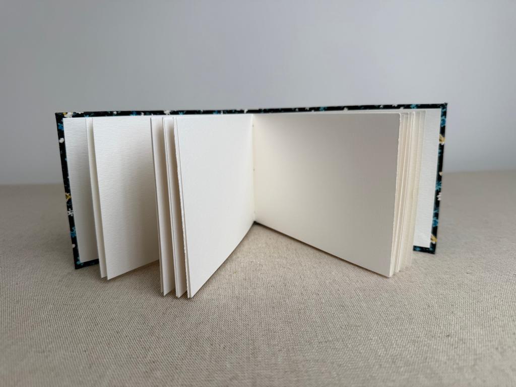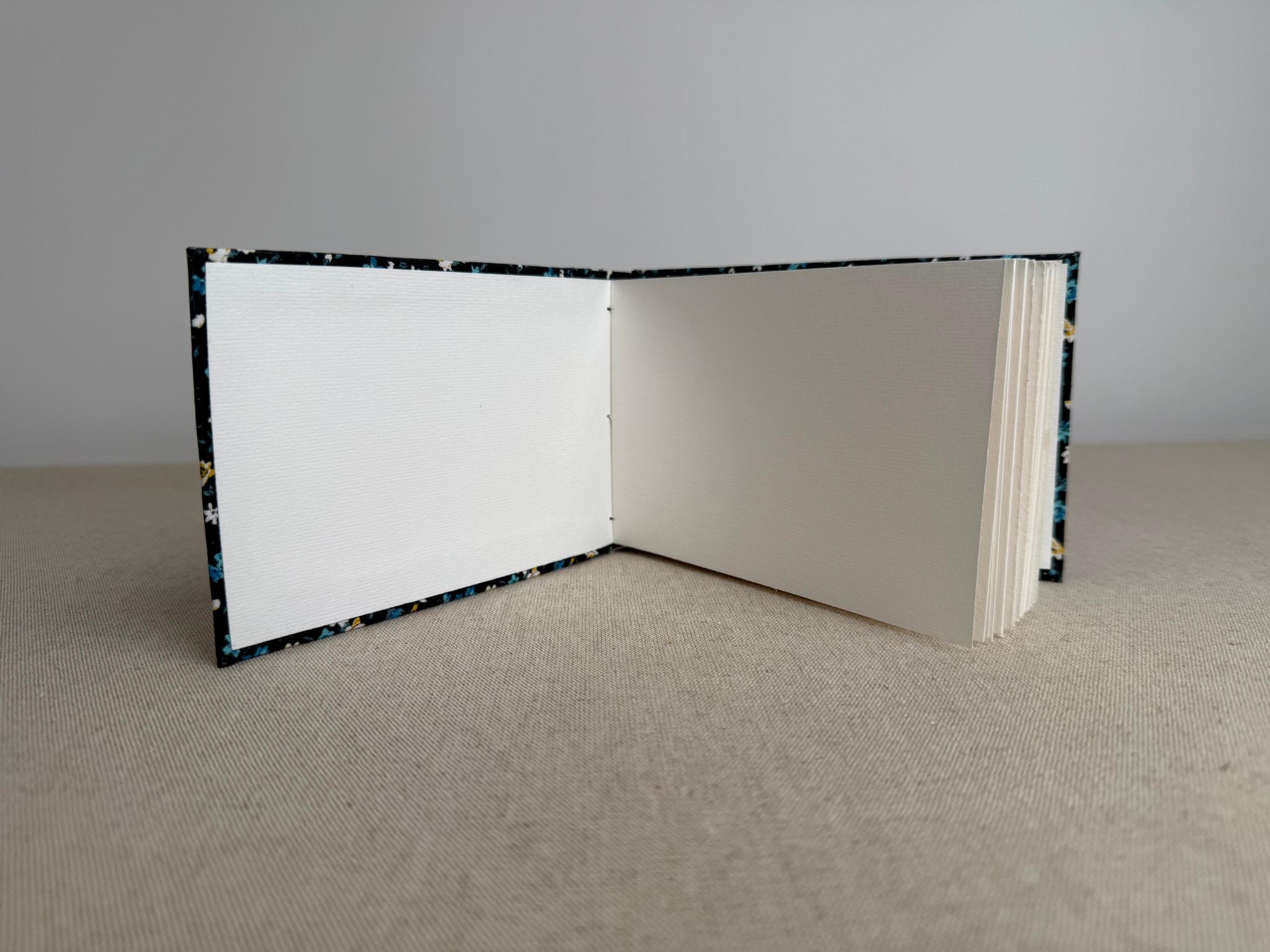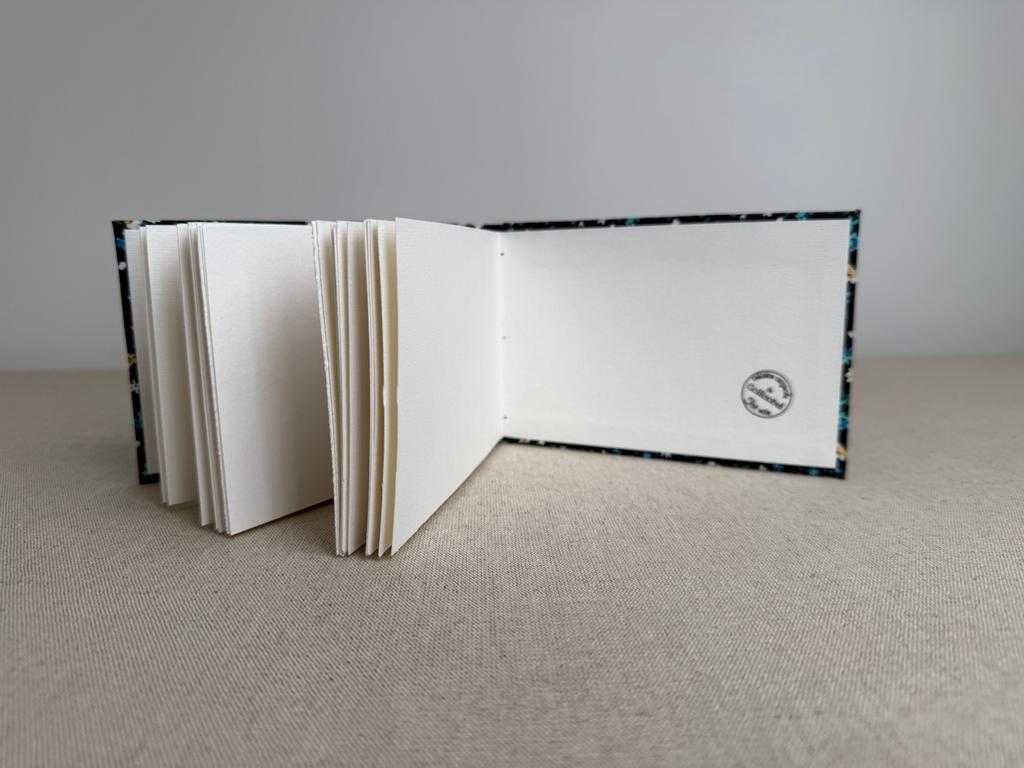 Carnet artisanal avec un très beau papier aquarelle épais de 225 g/m2, contenant 10 % de coton, avec une légère surface granuleuse. Les couleurs y adhérent parfaitement, même les tons doux, avec une dispersion légère.