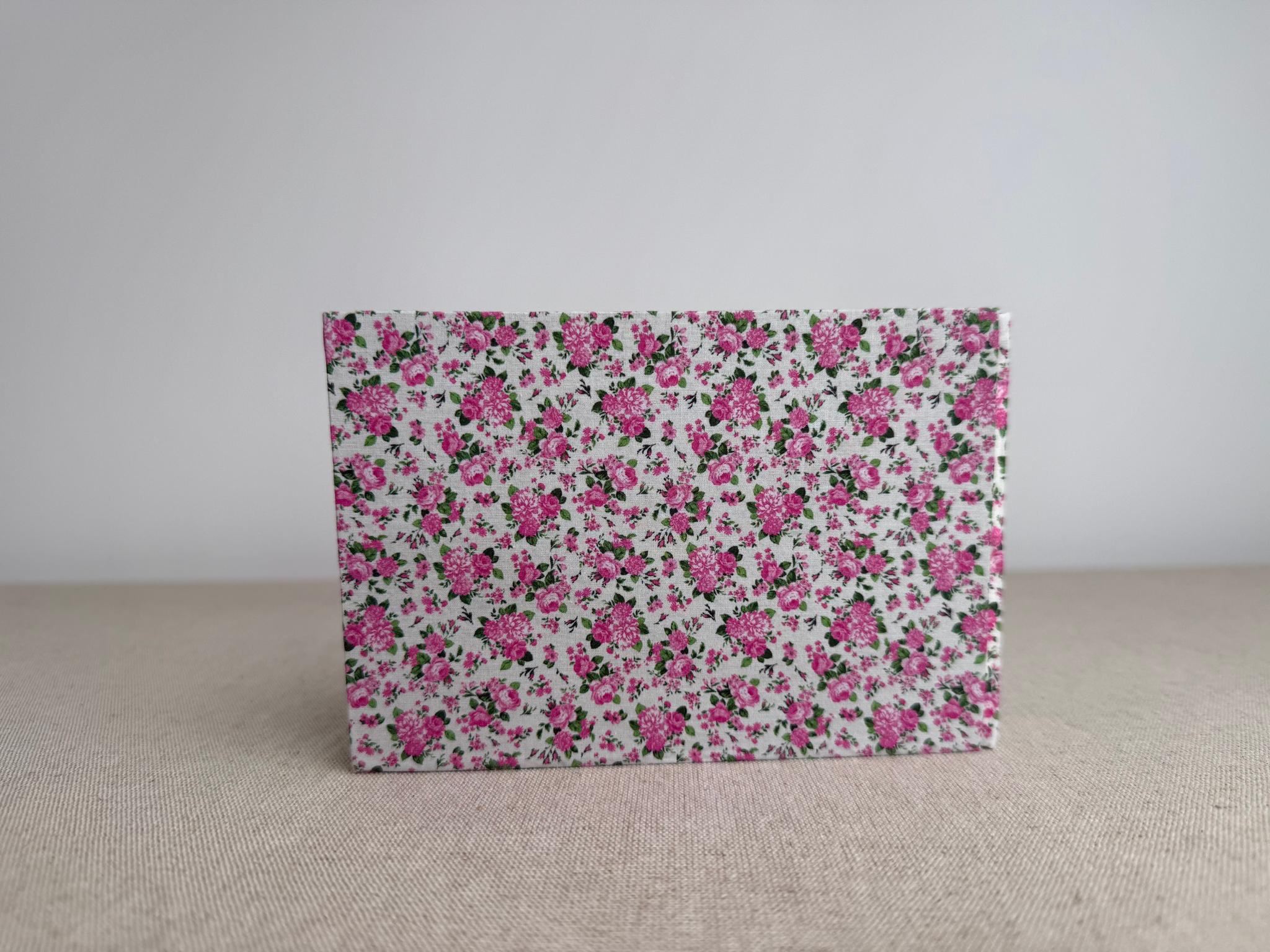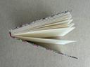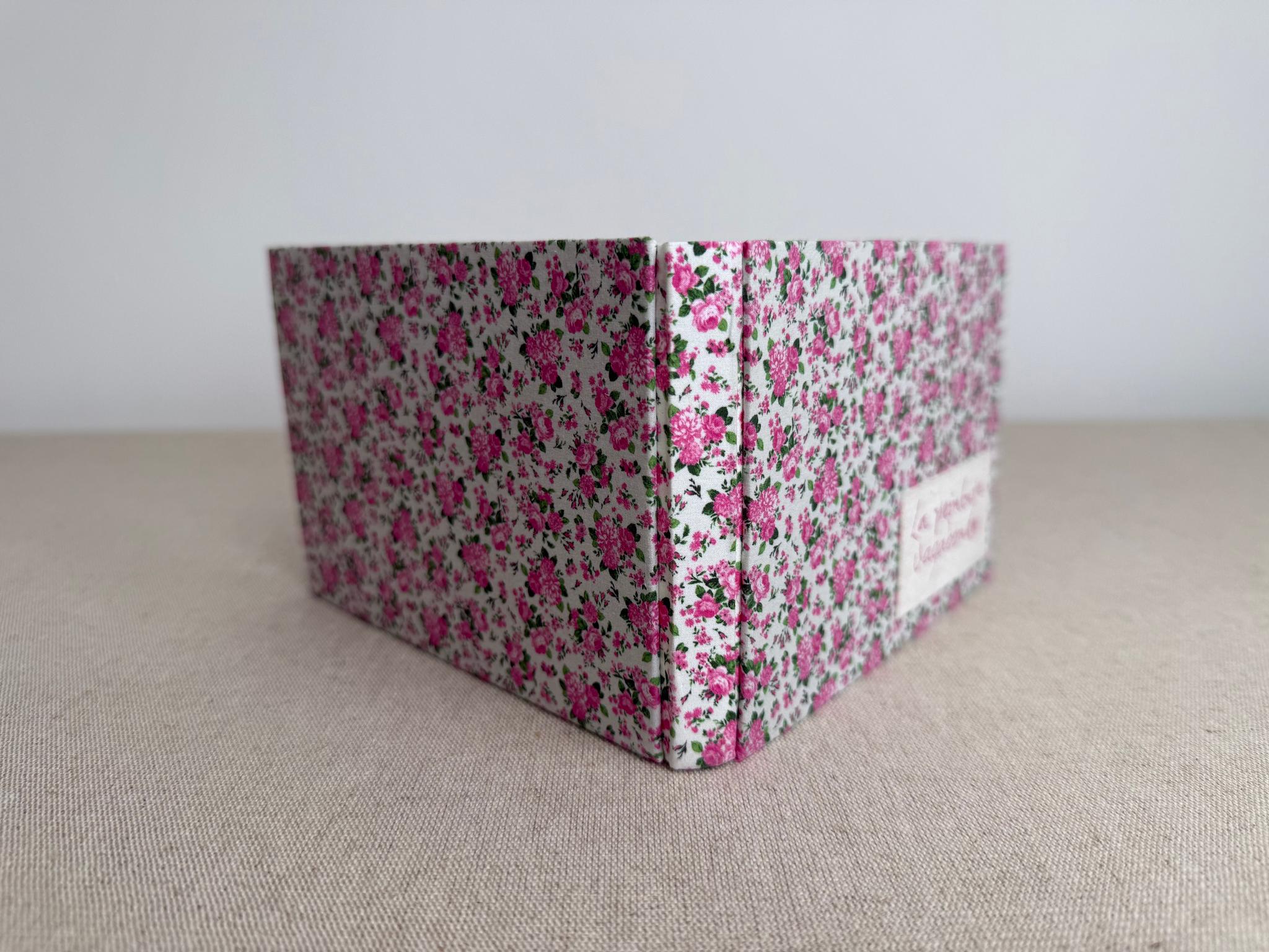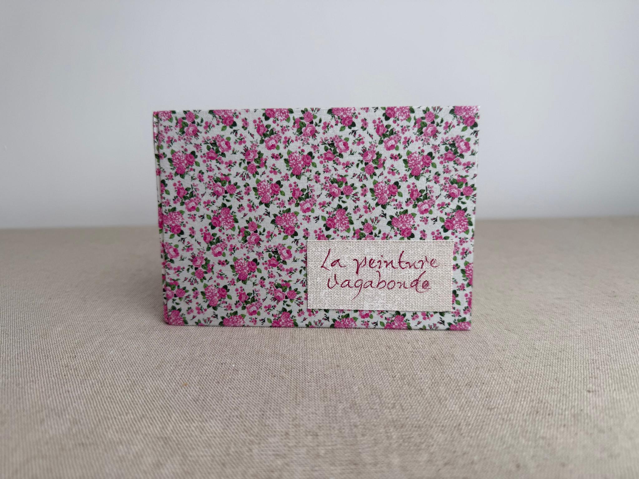 Couverture en carton recyclé rigide recouverte d’un tissu imprimé en coton et d’une étiquette calligraphiée au pinceau puis collée.