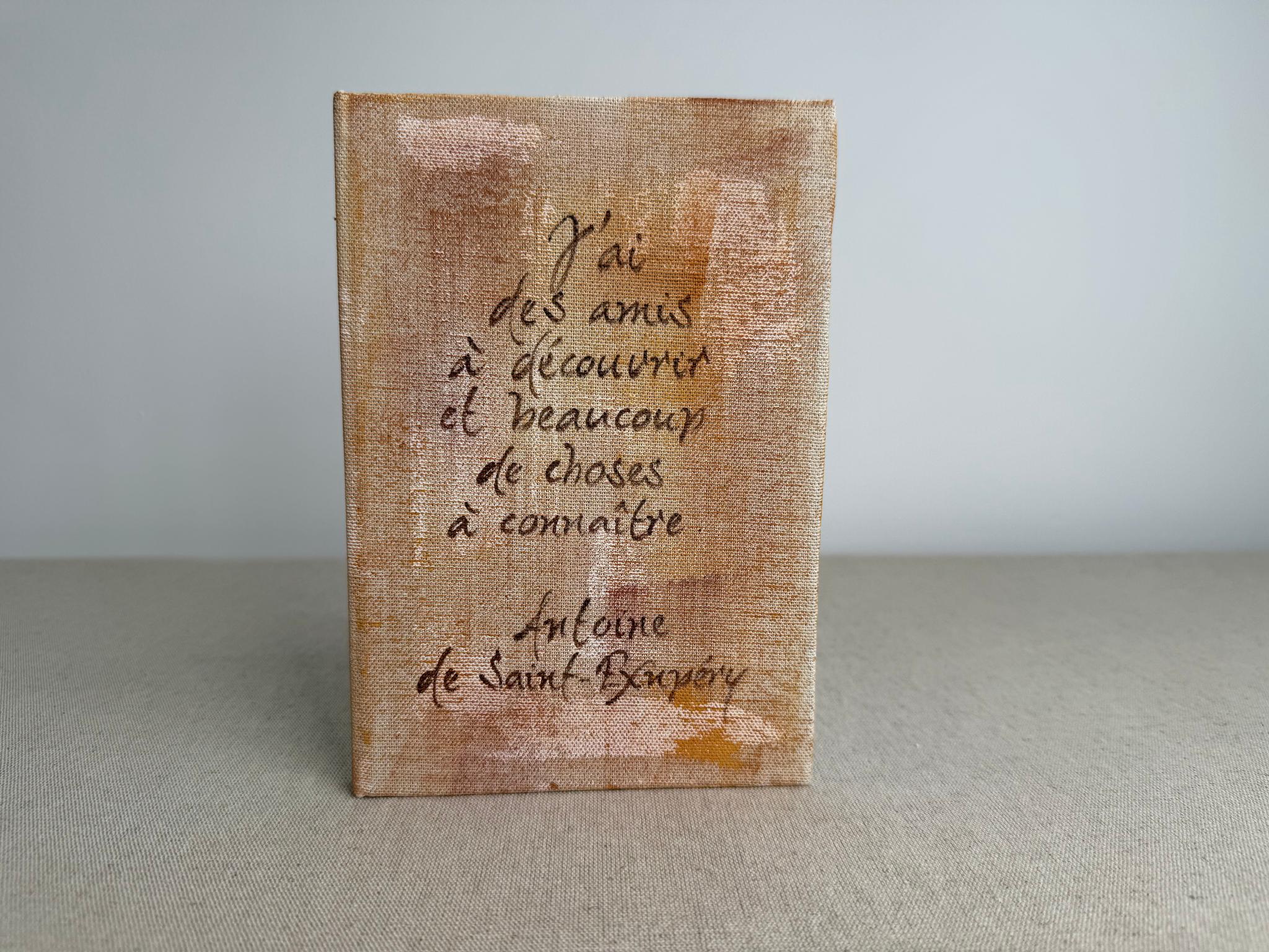 Cet article est unique, il a été fabriqué à la main par mes propres soins dans mon atelier de la région lyonnaise. Je fabrique habituellement par séries d’une dizaine d’articles du même type (même forme, même dimensions), mais aucun n’est identique : tous ont quelque chose de différent, que ce soit au niveau des couleurs, du texte calligraphié ou même de l’orientation des tissus. C’est pour cela que mes articles vendus en ligne sont numérotés. En savoir plus