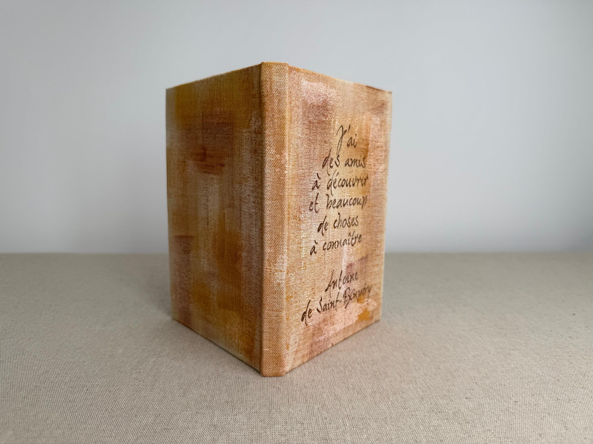 Couverture en carton recyclé rigide recouverte d’un tissu calligraphié au pinceau à l’encre et légèrement vernie.