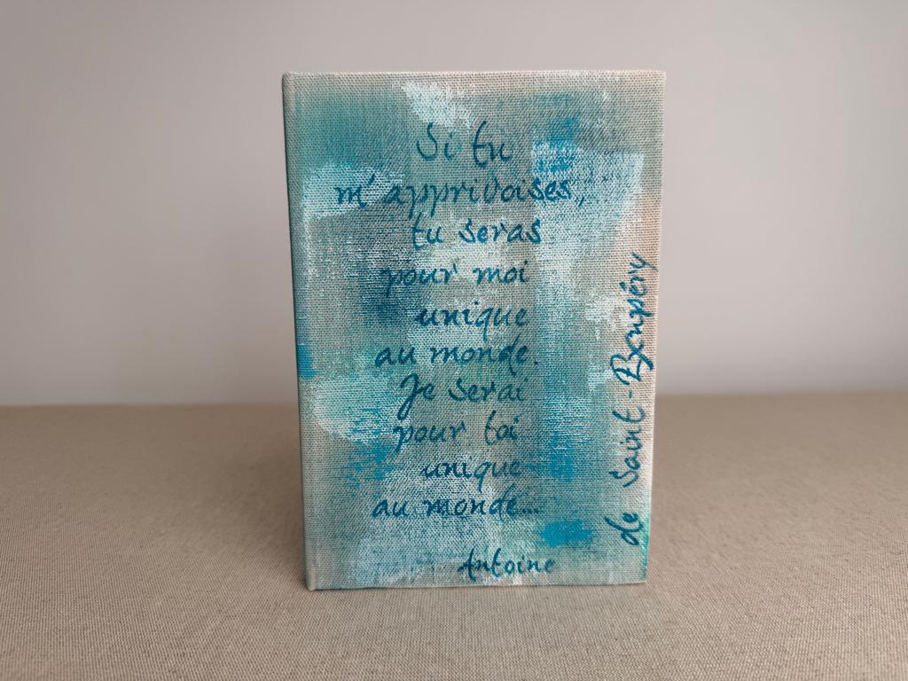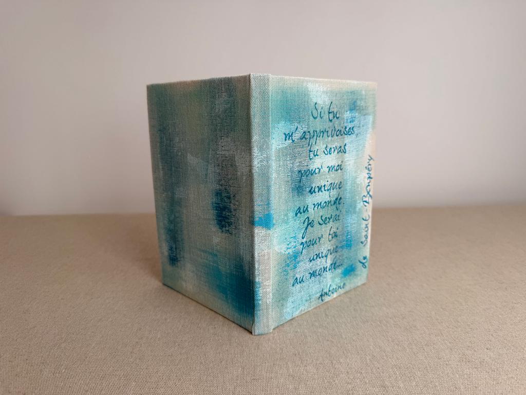 Cet article est unique, il a été fabriqué à la main par mes propres soins dans mon atelier de la région lyonnaise. Je fabrique habituellement par séries d’une dizaine d’articles du même type (même forme, même dimensions), mais aucun n’est identique : tous ont quelque chose de différent, que ce soit au niveau des couleurs, du texte calligraphié ou même de l’orientation des tissus. C’est pour cela que mes articles vendus en ligne sont numérotés. En savoir plus