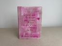 Cet article est unique, il a été fabriqué à la main par mes propres soins dans mon atelier de la région lyonnaise. Je fabrique habituellement par séries d’une dizaine d’articles du même type (même forme, même dimensions), mais aucun n’est identique : tous ont quelque chose de différent, que ce soit au niveau des couleurs, du texte calligraphié ou même de l’orientation des tissus. C’est pour cela que mes articles vendus en ligne sont numérotés. En savoir plus