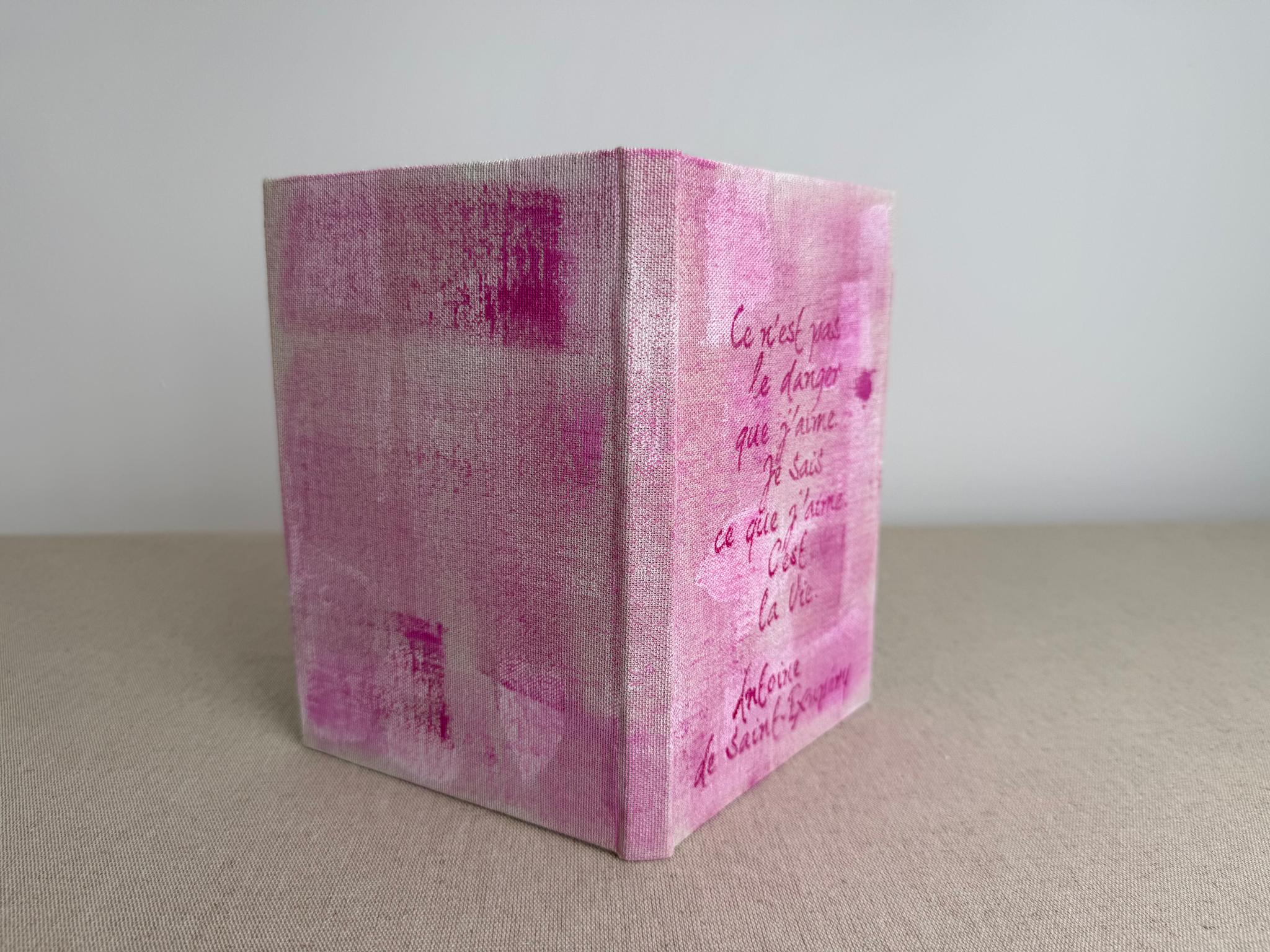 Couverture en carton recyclé rigide recouverte d’un tissu calligraphié au pinceau à l’encre et légèrement vernie.