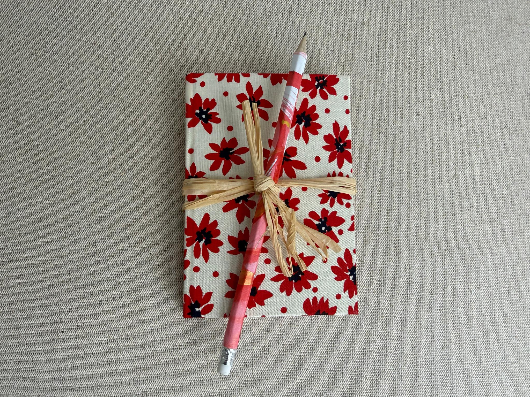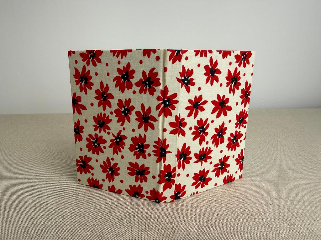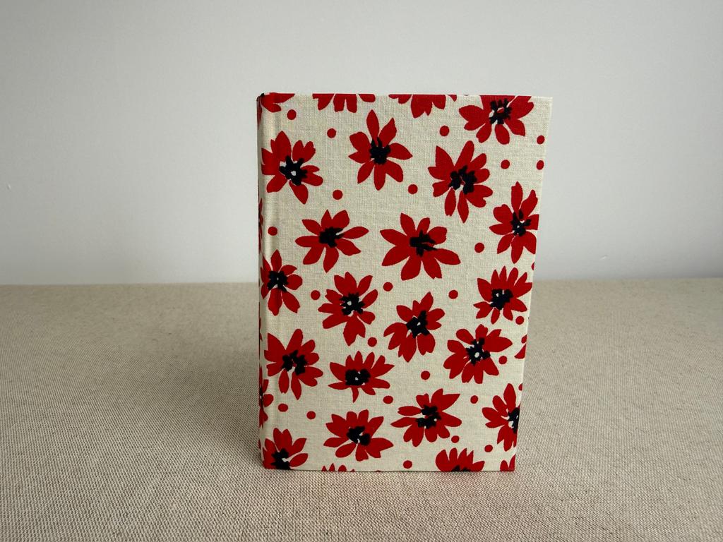 Couverture en carton recyclé rigide recouverte d’un tissu imprimé en coton.